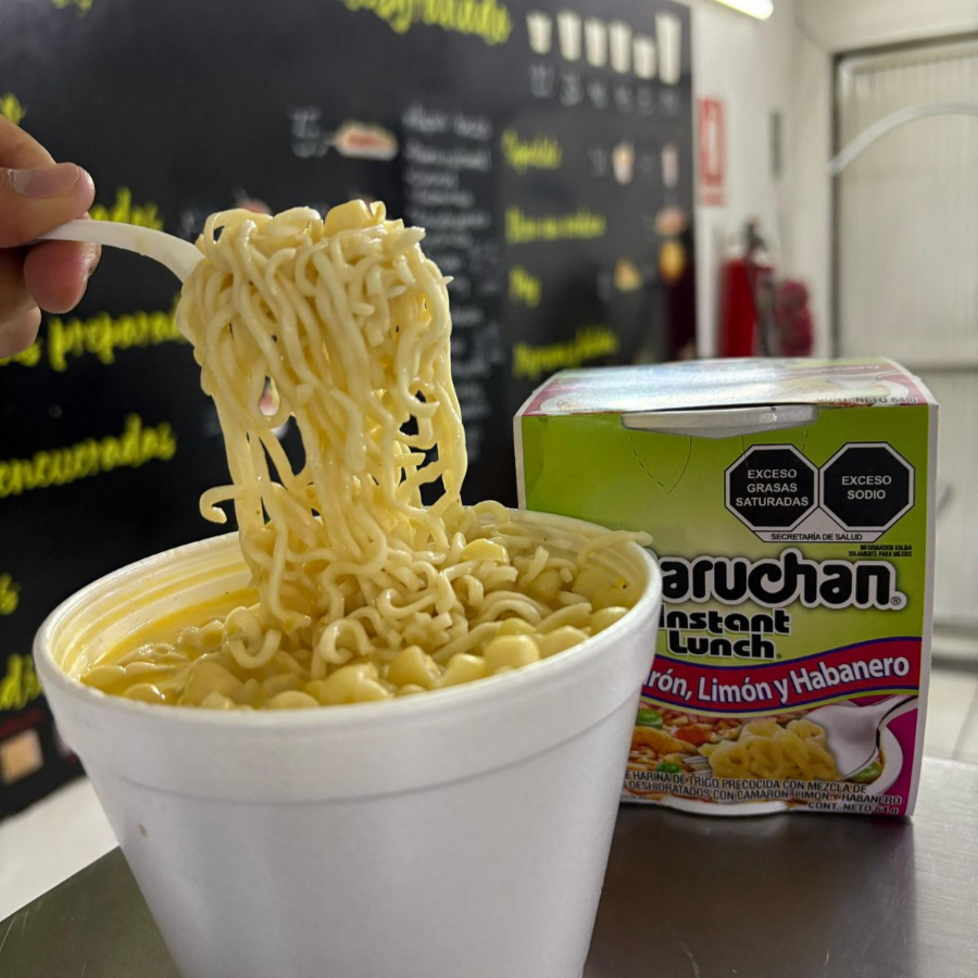 Sopa maruchan con elote, mantequilla, mayonesa, crema y queso