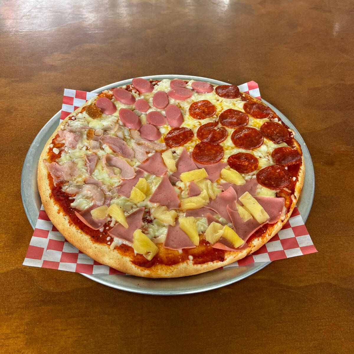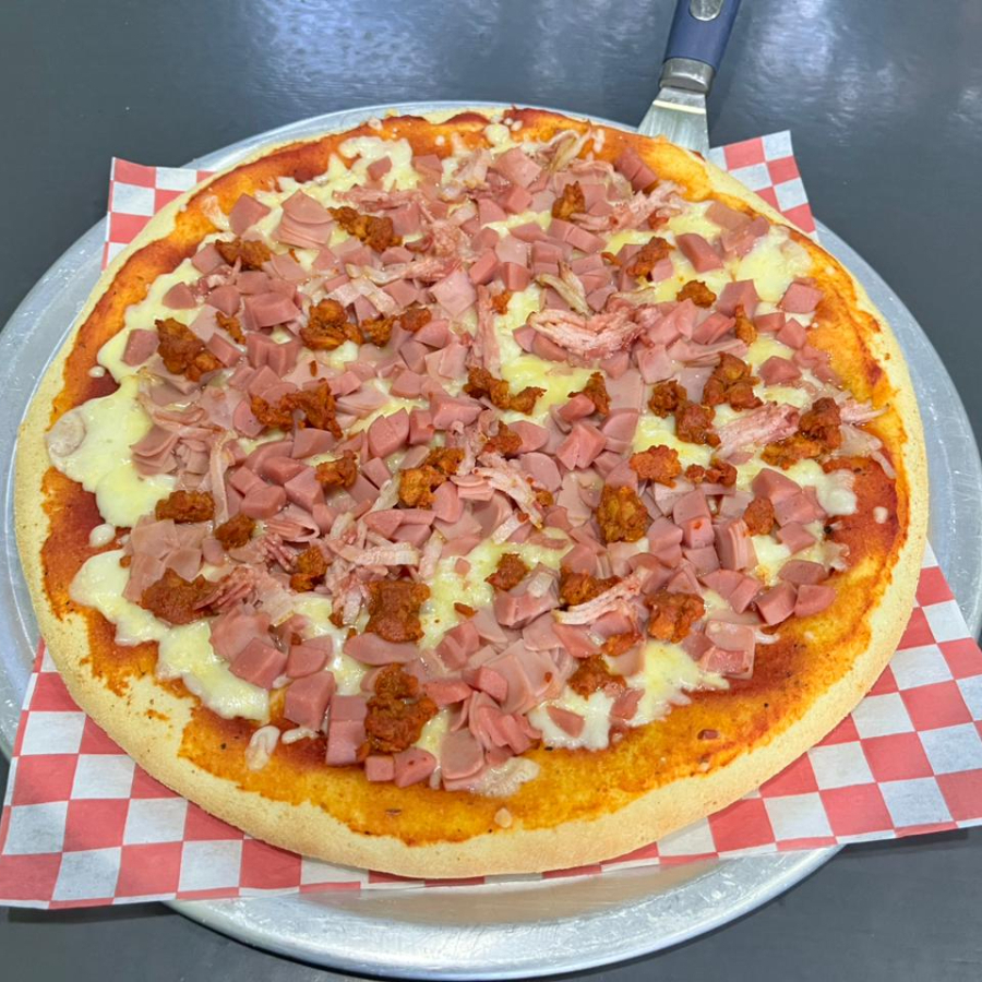 Pizza de 14 pulgadas, con salchicha, jamón, chorizo y tocino. Acompañada de catsup y salsa chimichurri