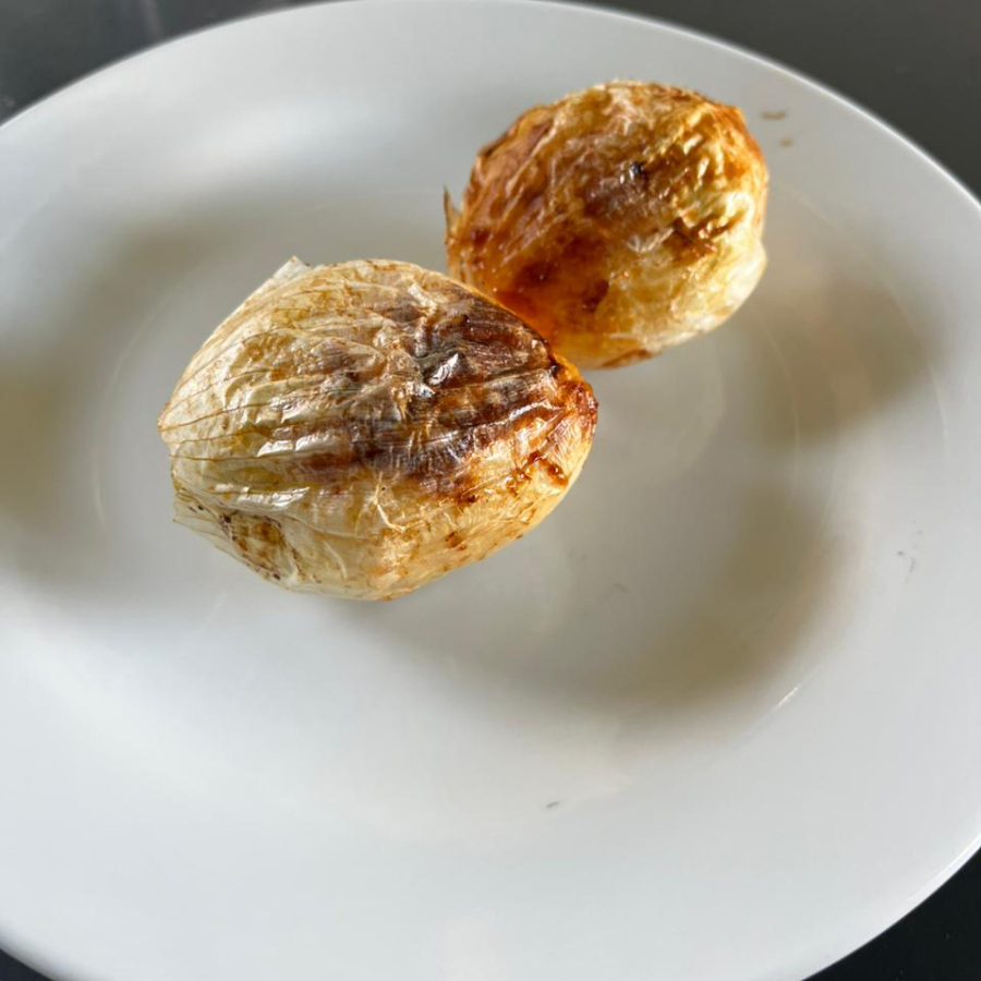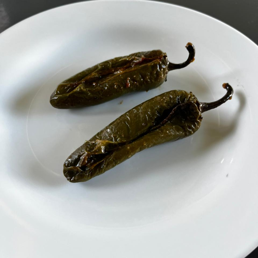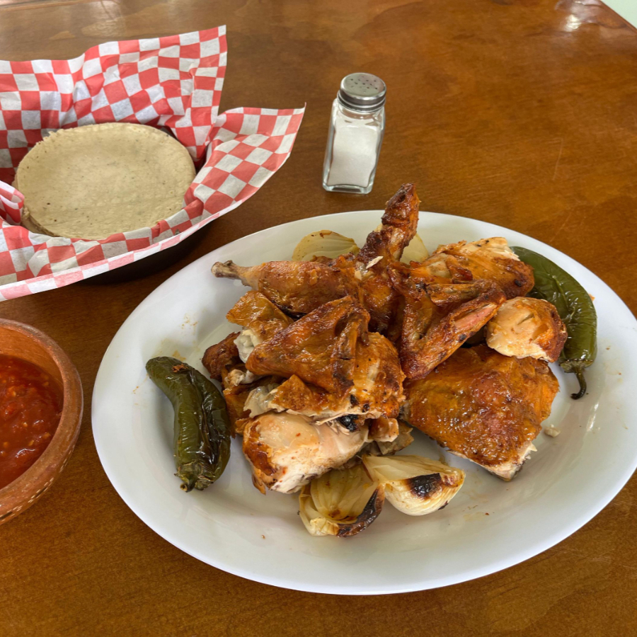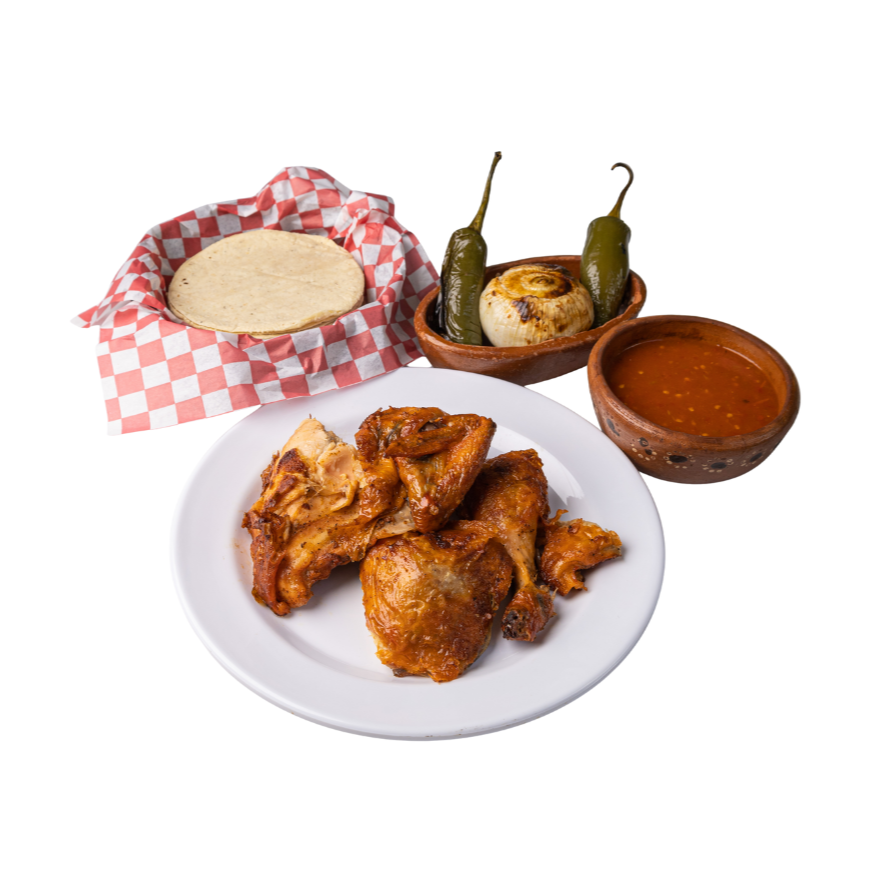 Pollo rostizado acompañado de cebolla asada, salsa de tomate y chiles toreados