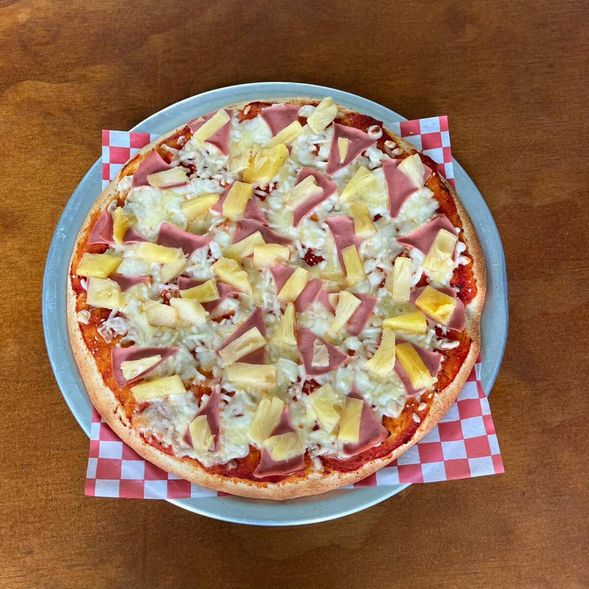 Pizza Hawaiiana de 14" con Jamón y Piña. Acompañada de aderezo Chimichurri y catsup