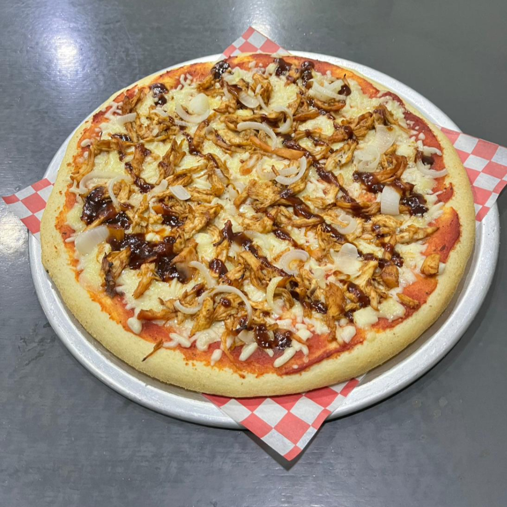Deliciosa Pizza de 14" con bollo aderezado con salsa barbecue