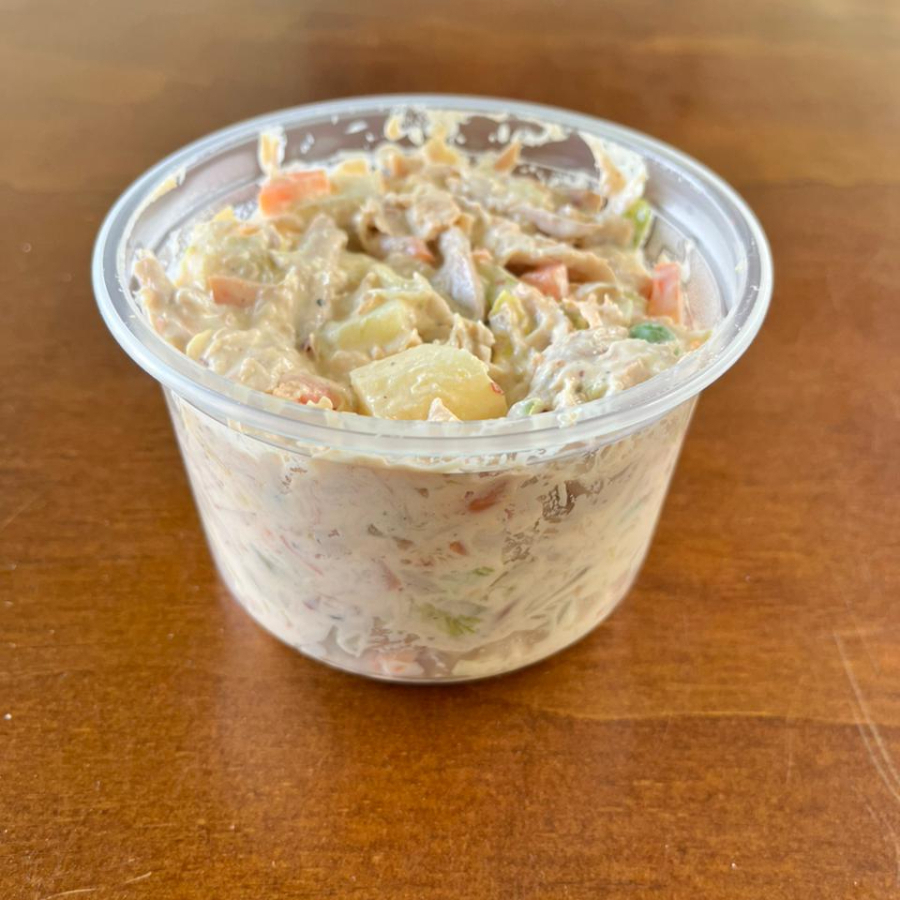 Ensalada de pollo, contiene zanahoria, chicharos, lechuga, mayonesa, crema y mostaza