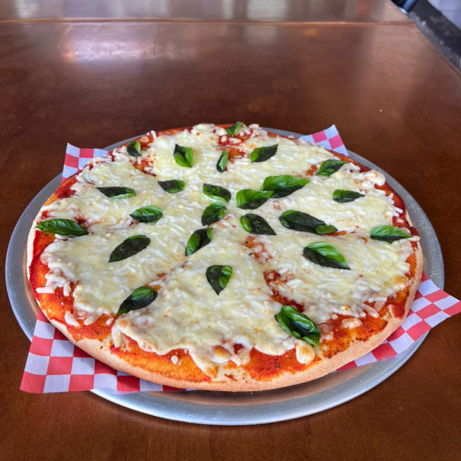 La pizza margarita es nuestra opción vegetariana, de 14 pulgadas con rico queso y albahaca fresca de nuestro jardin