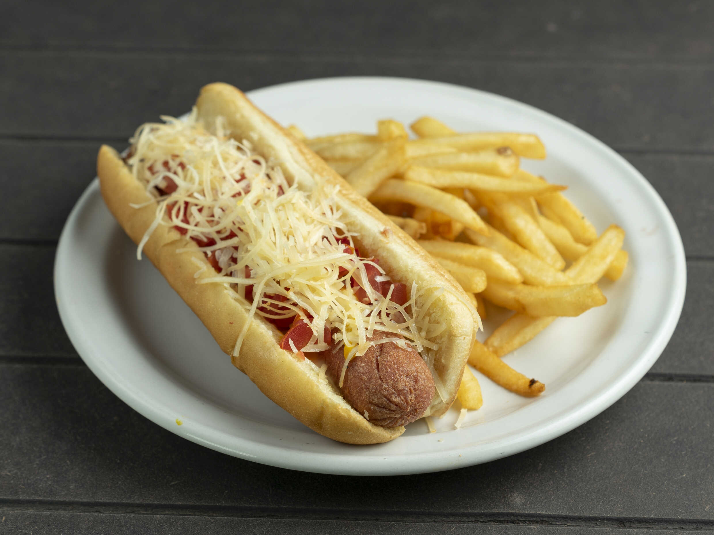 pan, salchicha de pavo, queso, crema. papas a la francesa