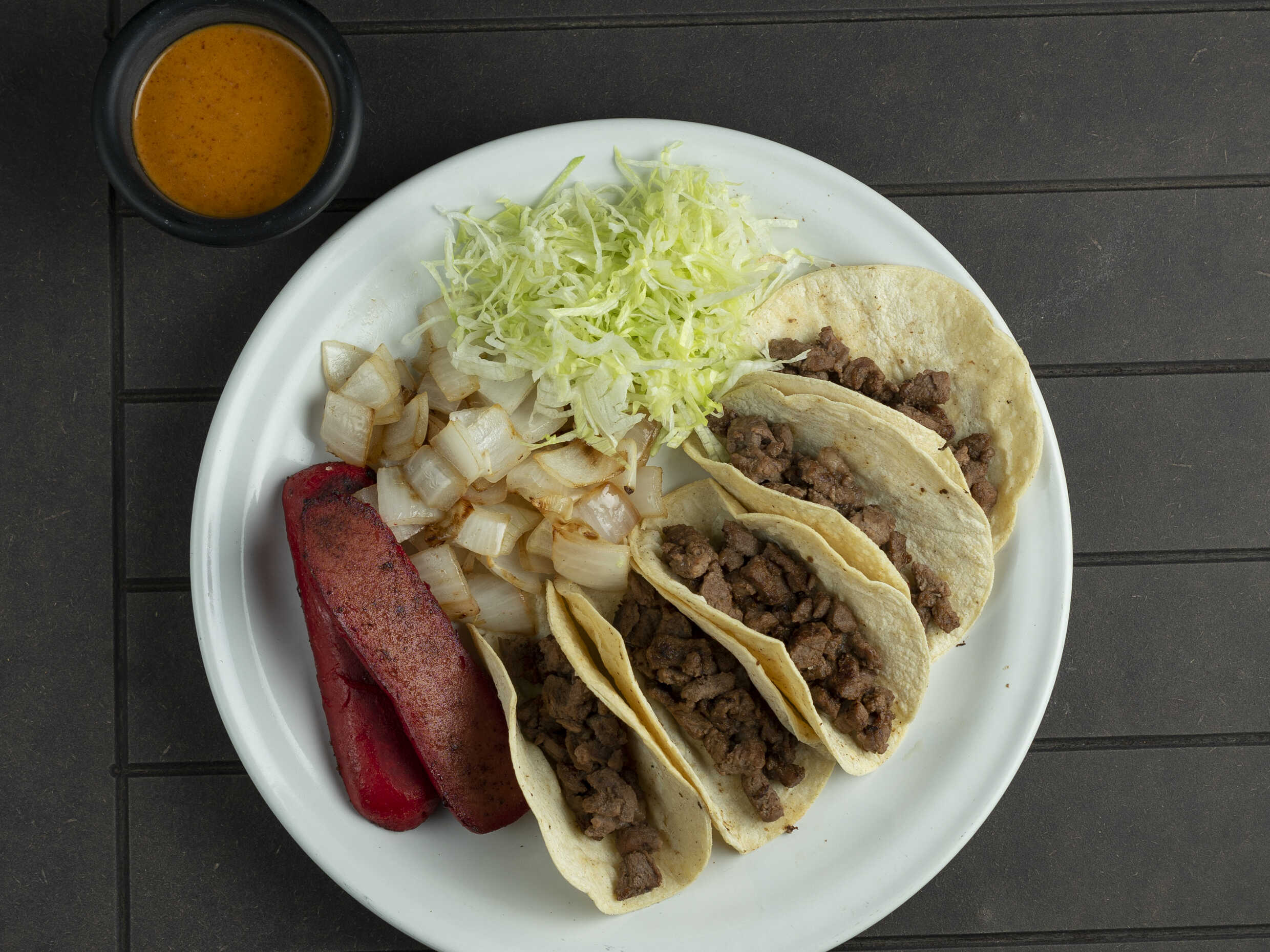 Carne asada, salchicha y cebolla asada.