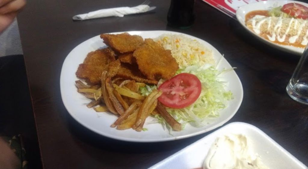 Filete de pescado empanizado, lechuga, arroz y papas a la francesa