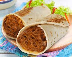 Burrito enchilado tipo a la diabla, carne deshebrada preparada en salsa roja especial, en tortilla de harina.