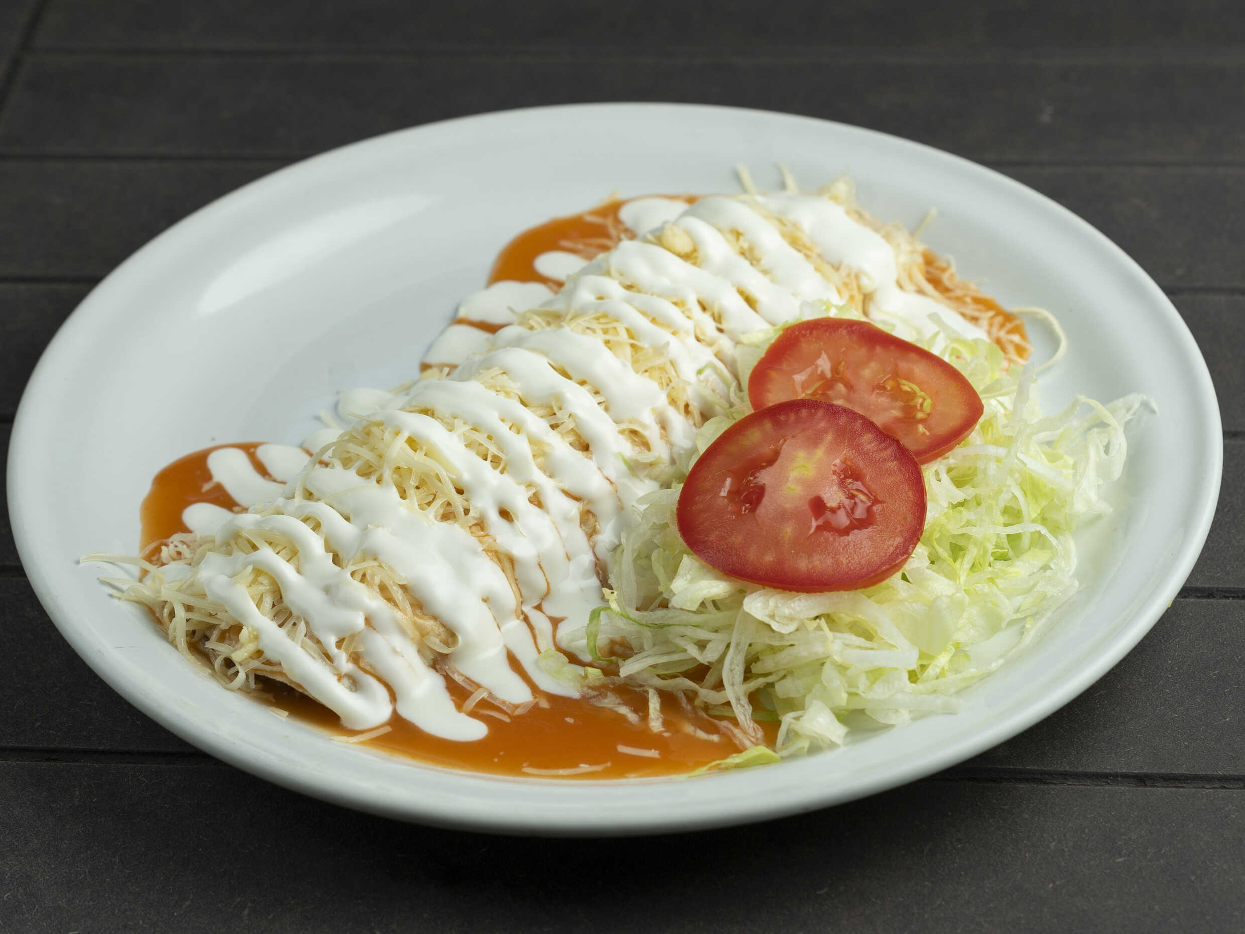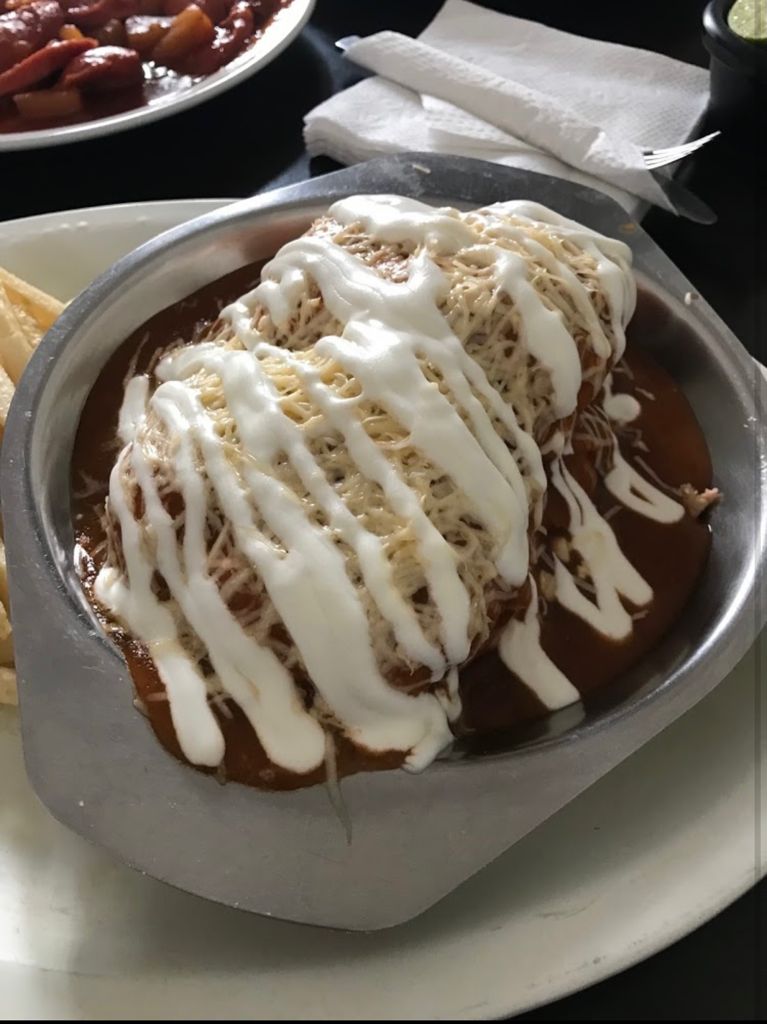Burrito de carne deshebrada, bañado en salsa roja, queso y crema.