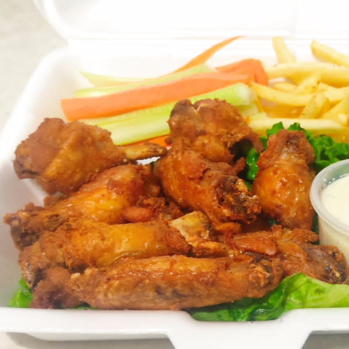 Alitas, salsa búfalo, papas a la francesa, apio, zanahoria y aderezo ranch