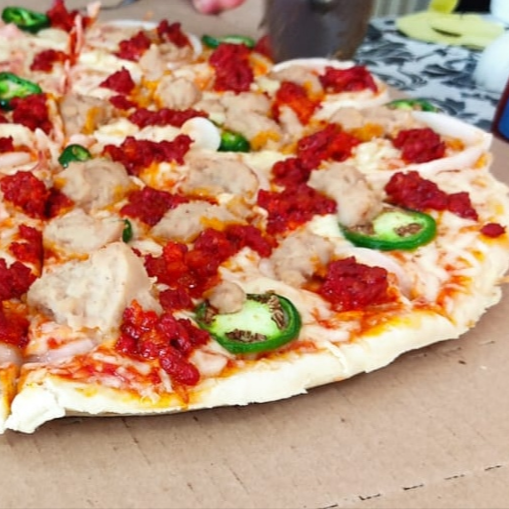 Pie de pizza, salsa de tomate, queso, mitad peperoni, mitad jalapeño, cebolla y atun.