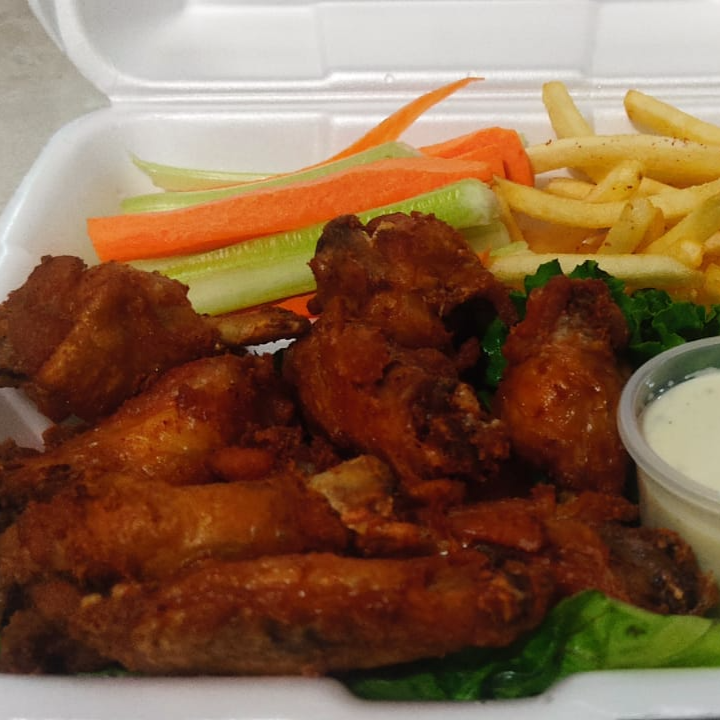 Alitas, salsa BBQ, papas a la francesa, apio, zanahoria y aderezo ranch