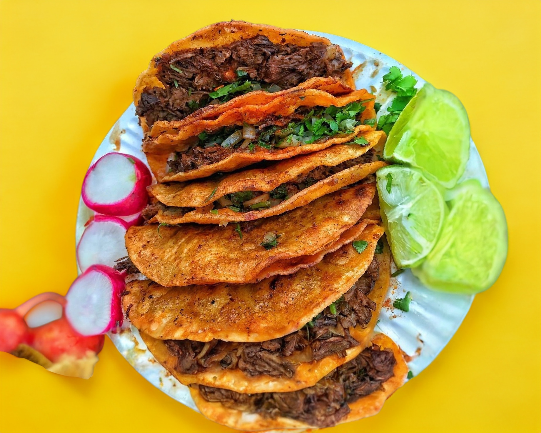 4 Tacos servidos en tortillas de maíz tamaño normal con nuestra birria estilo guadalajara, acompañados de consomé, repollo, cebolla, cilantro y salsa macha.