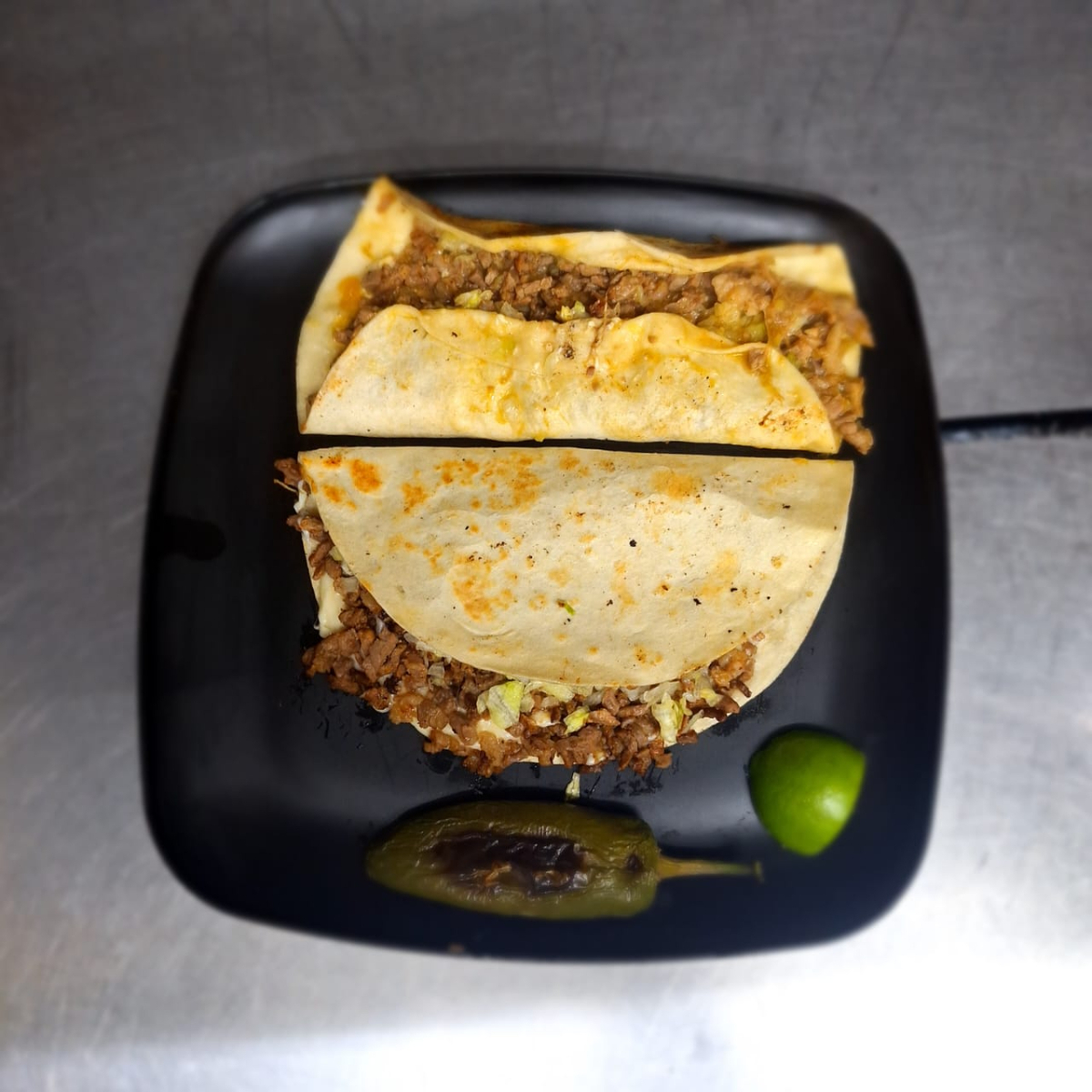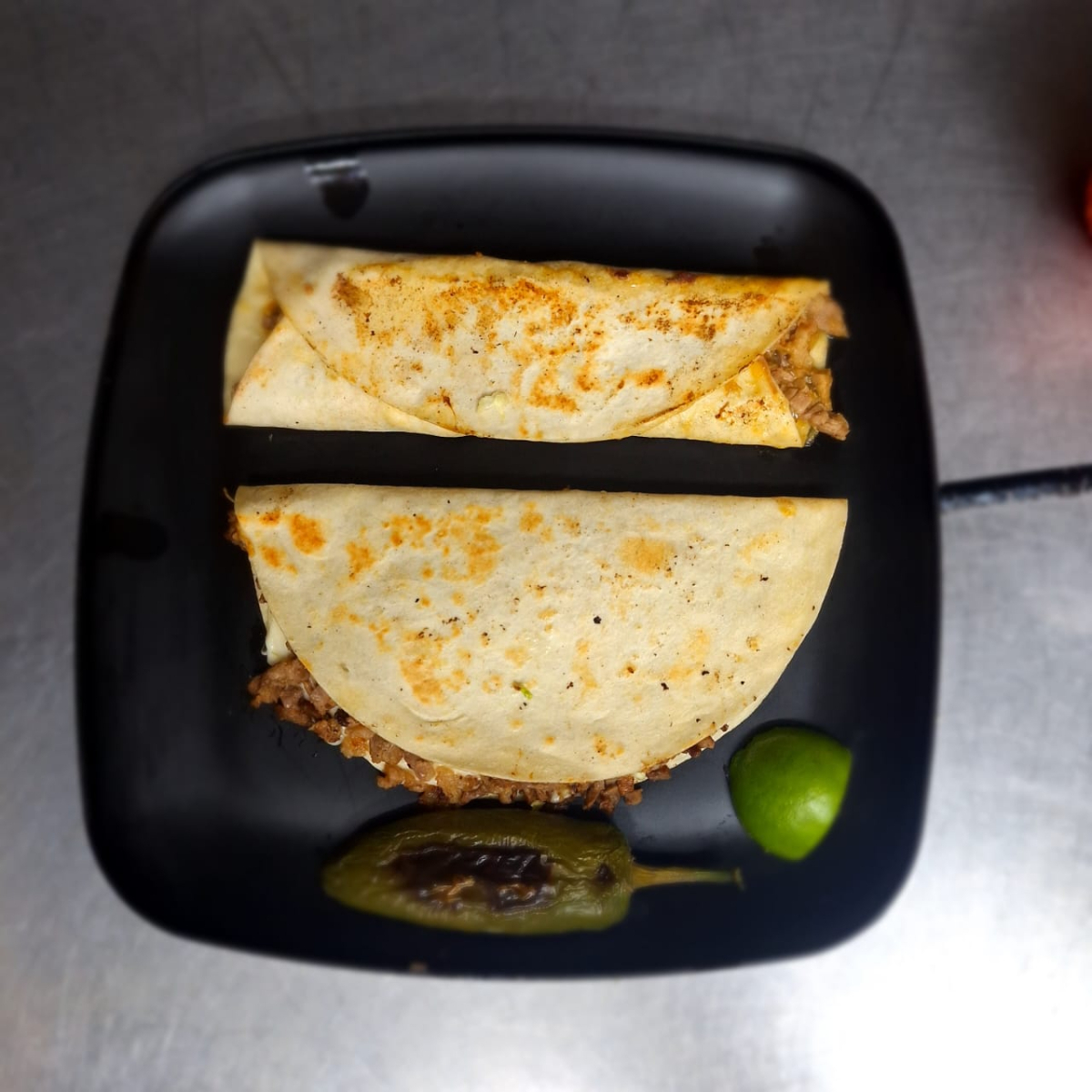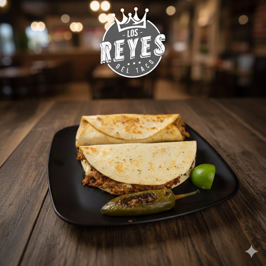 Tortilla de harina con carne al pastor o asada y queso fundido, servida caliente y doradita.
