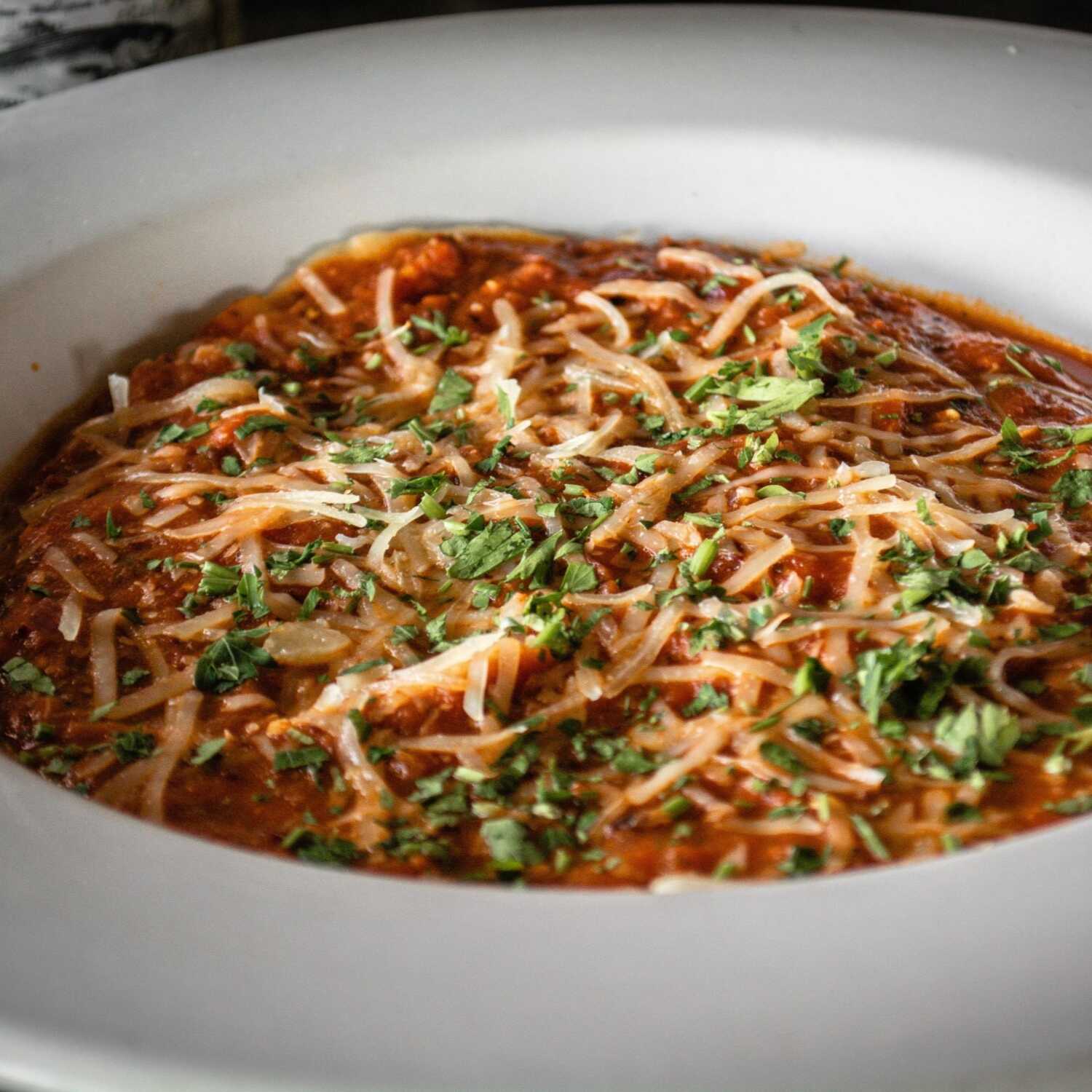 De ragú de res bañada en salsa pomodoro, salsa bechamel y queso parmesano. 200grs