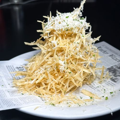 Bañada en salsa cremosa de tomate picante, gratinada con queso manchego y papas a la francesa. 200grs