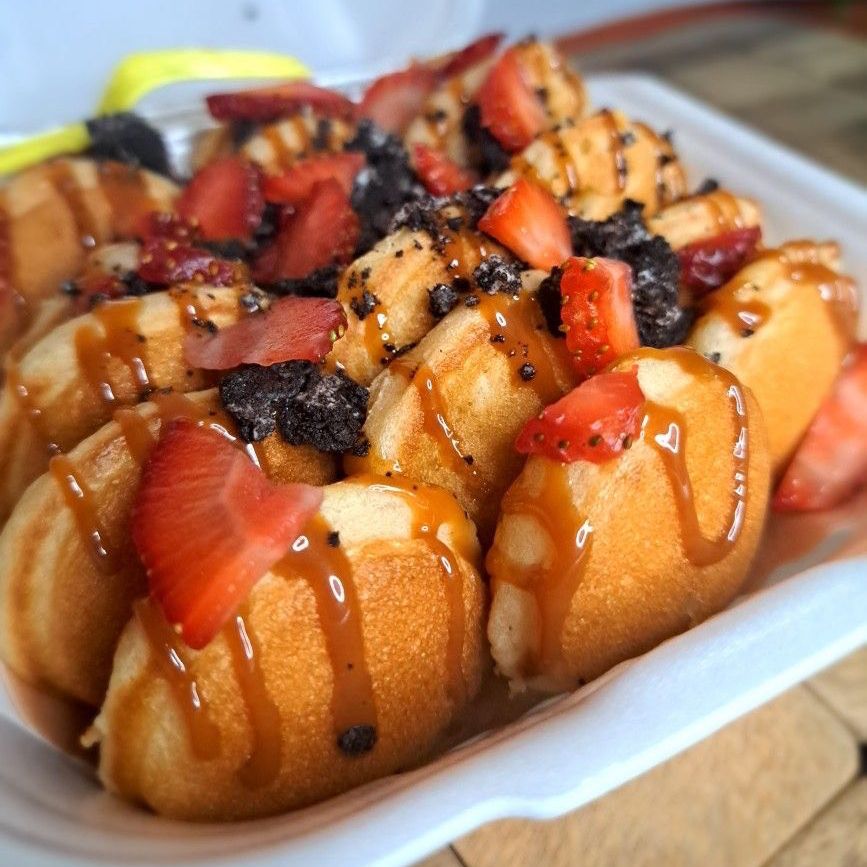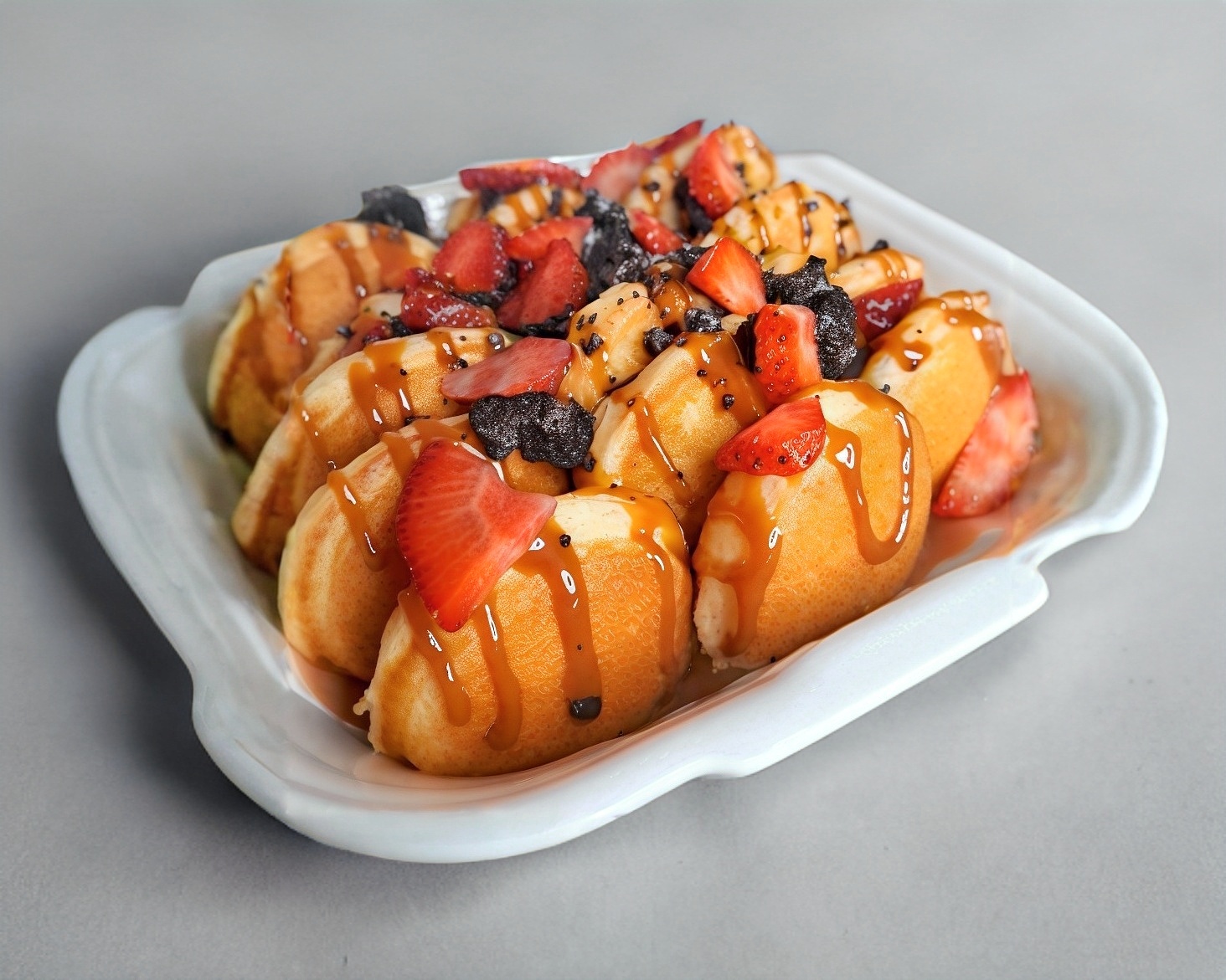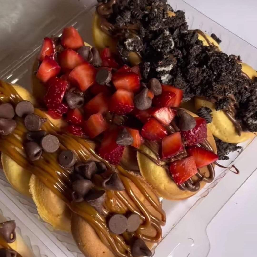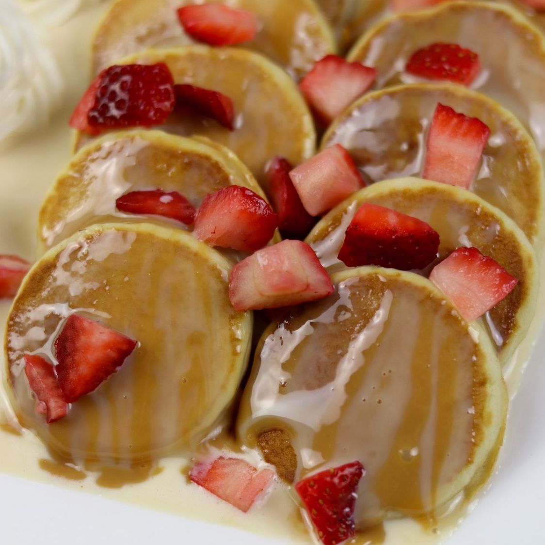 24 Mini hotcakes, 3 leches, toppings y 1 fruta
