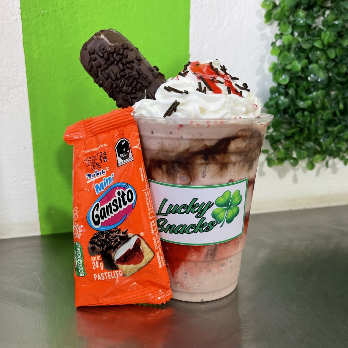 Fresas naturales, gomitas, skwinkles, mezclado con chamoy enchilado y tarugo de tamarindo