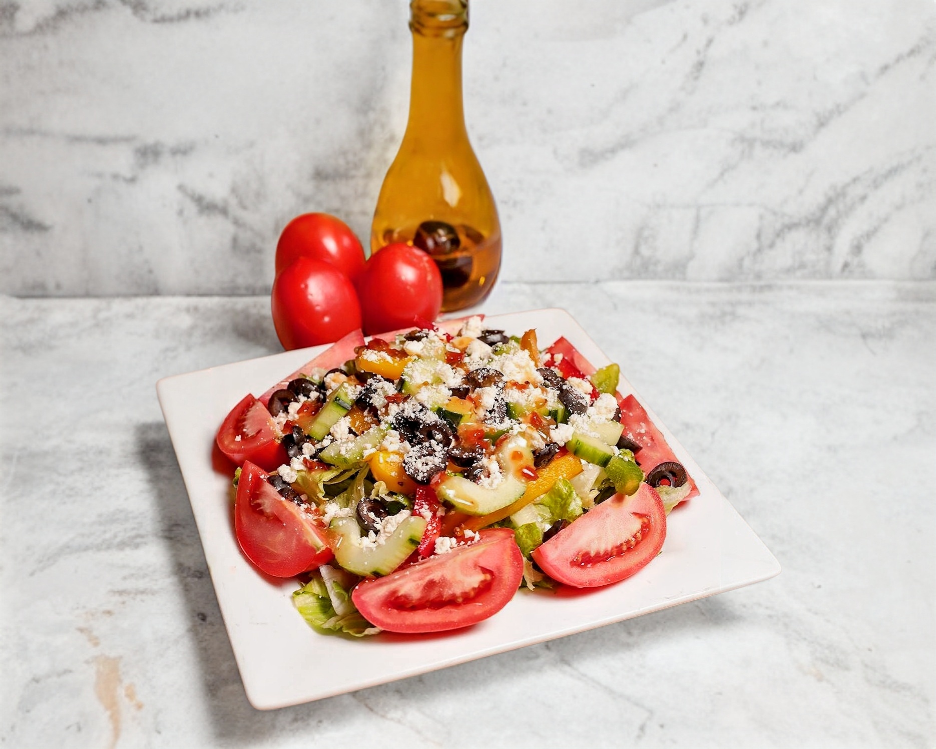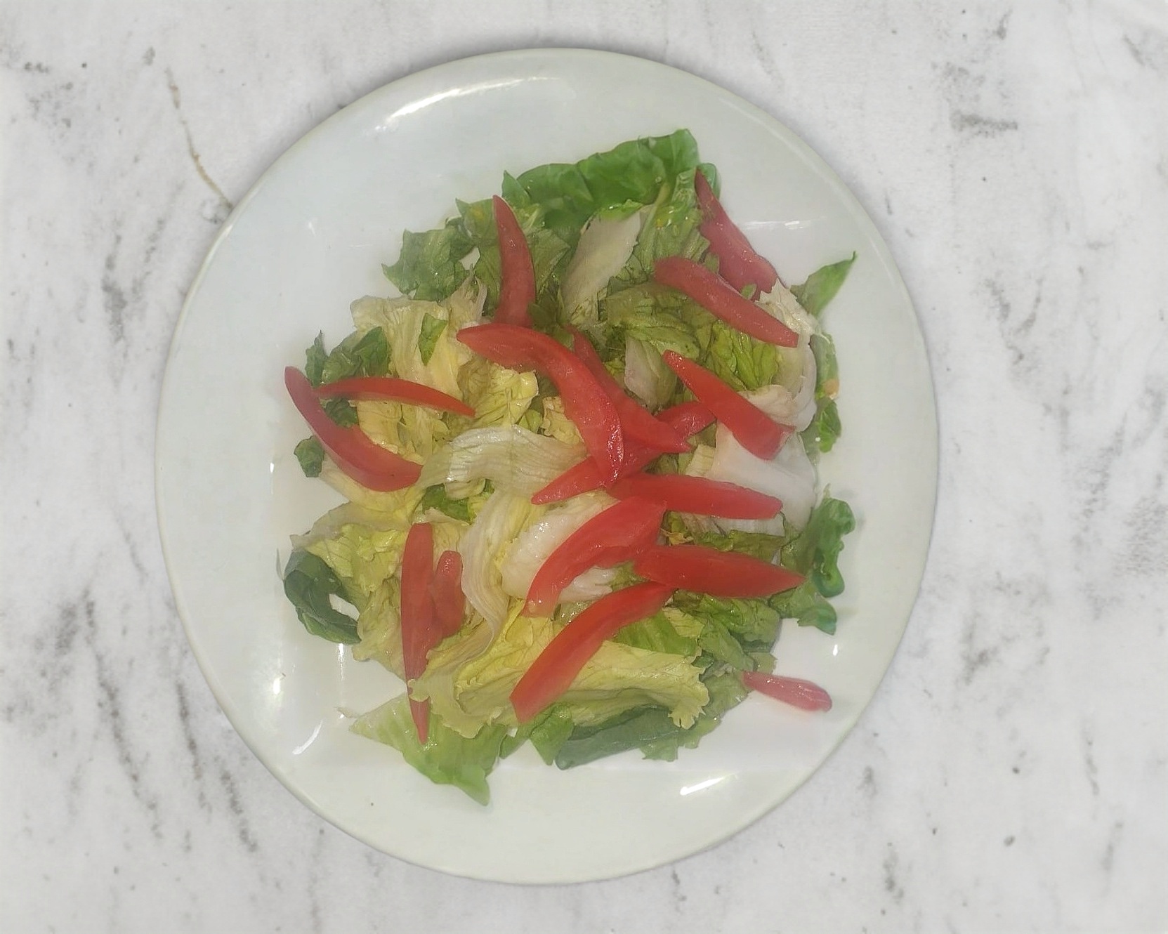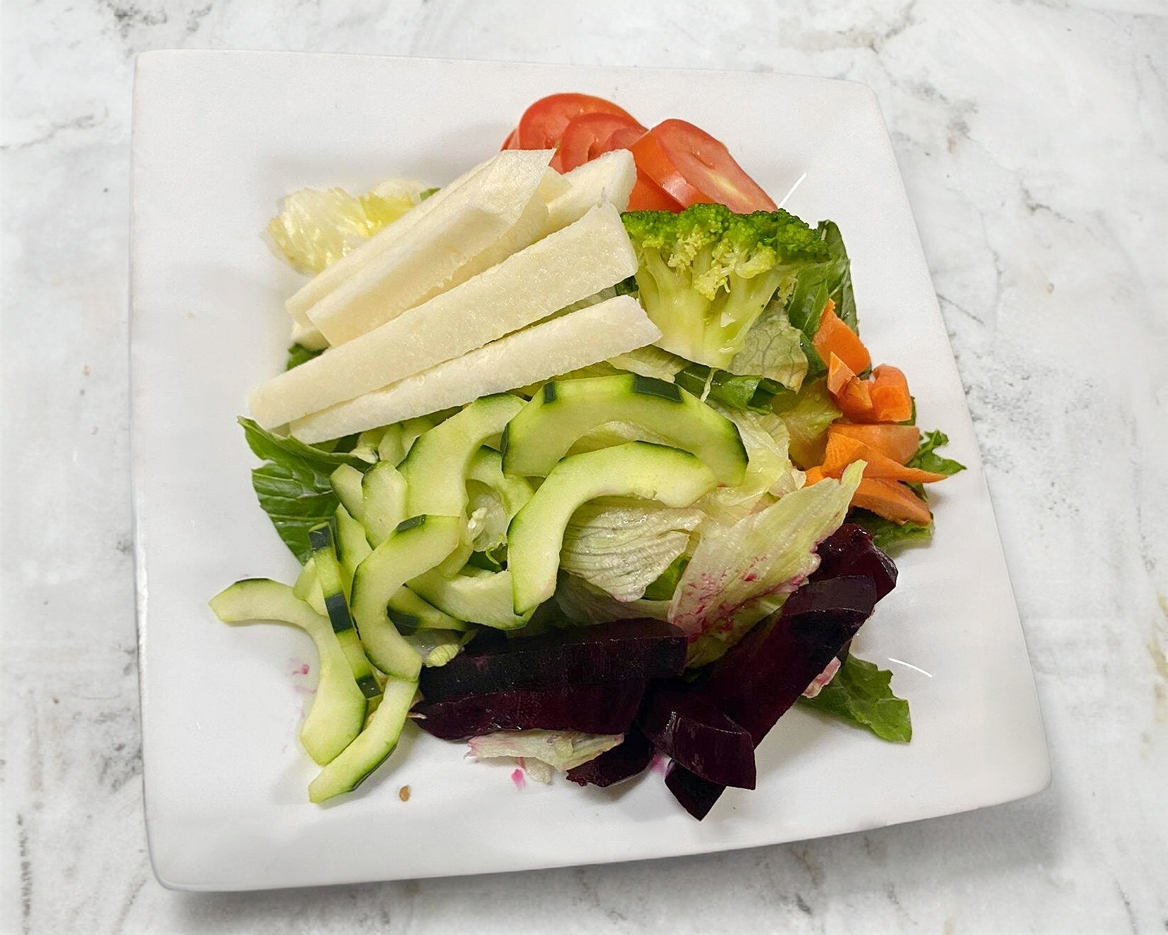 Lechuga, tomate, pepino, jícama, brócoli, betabel y aderezo.