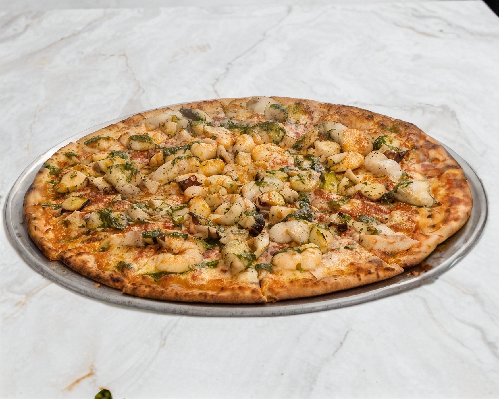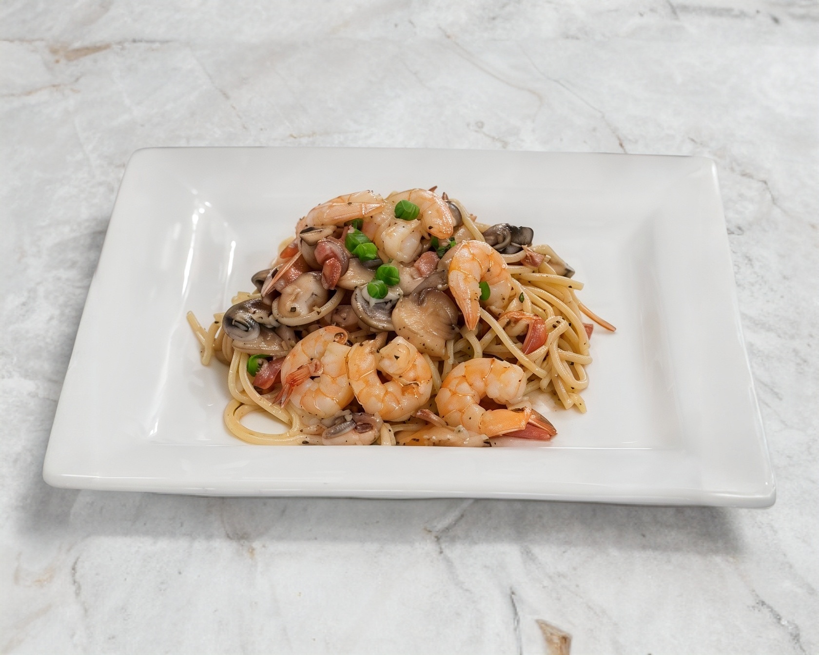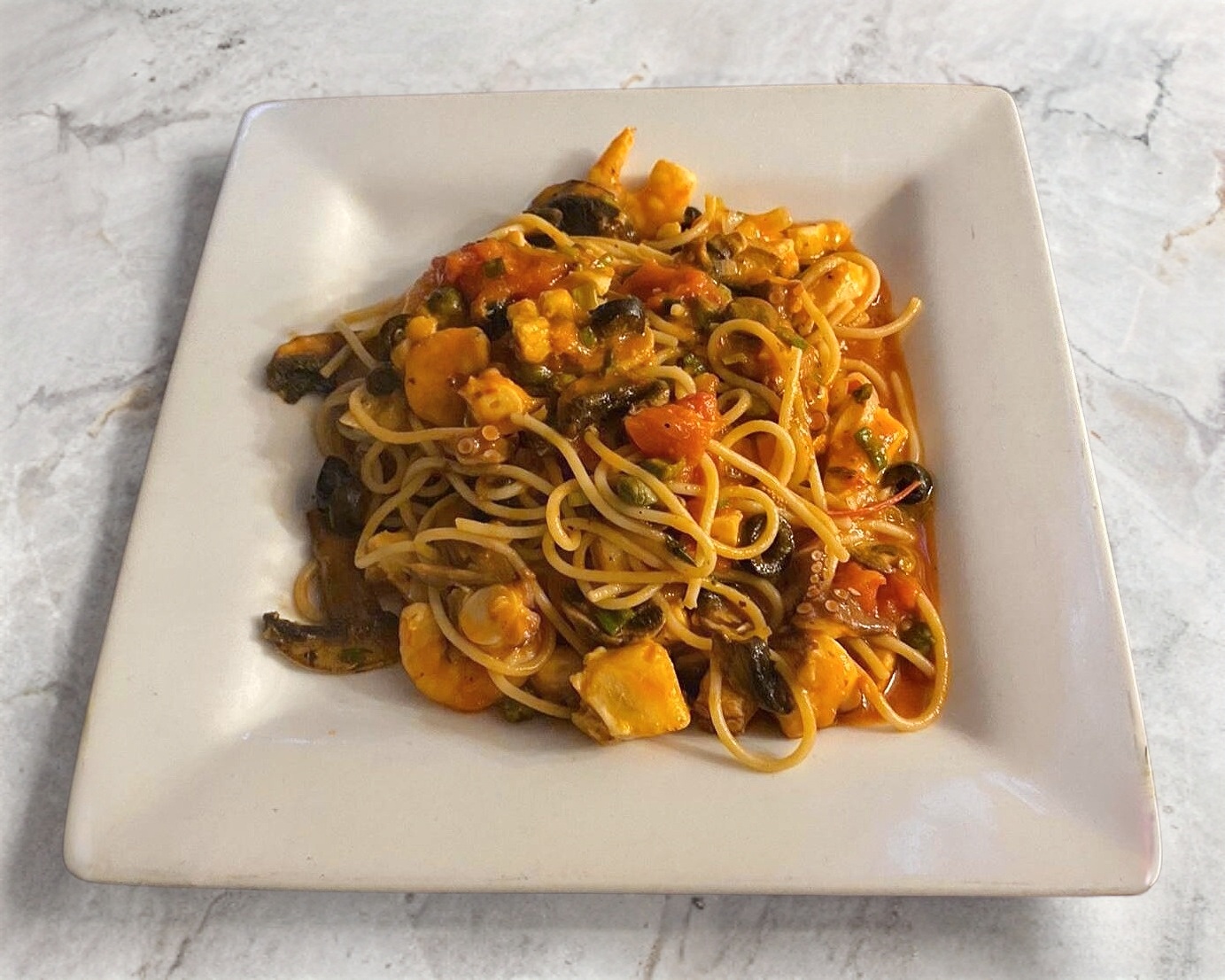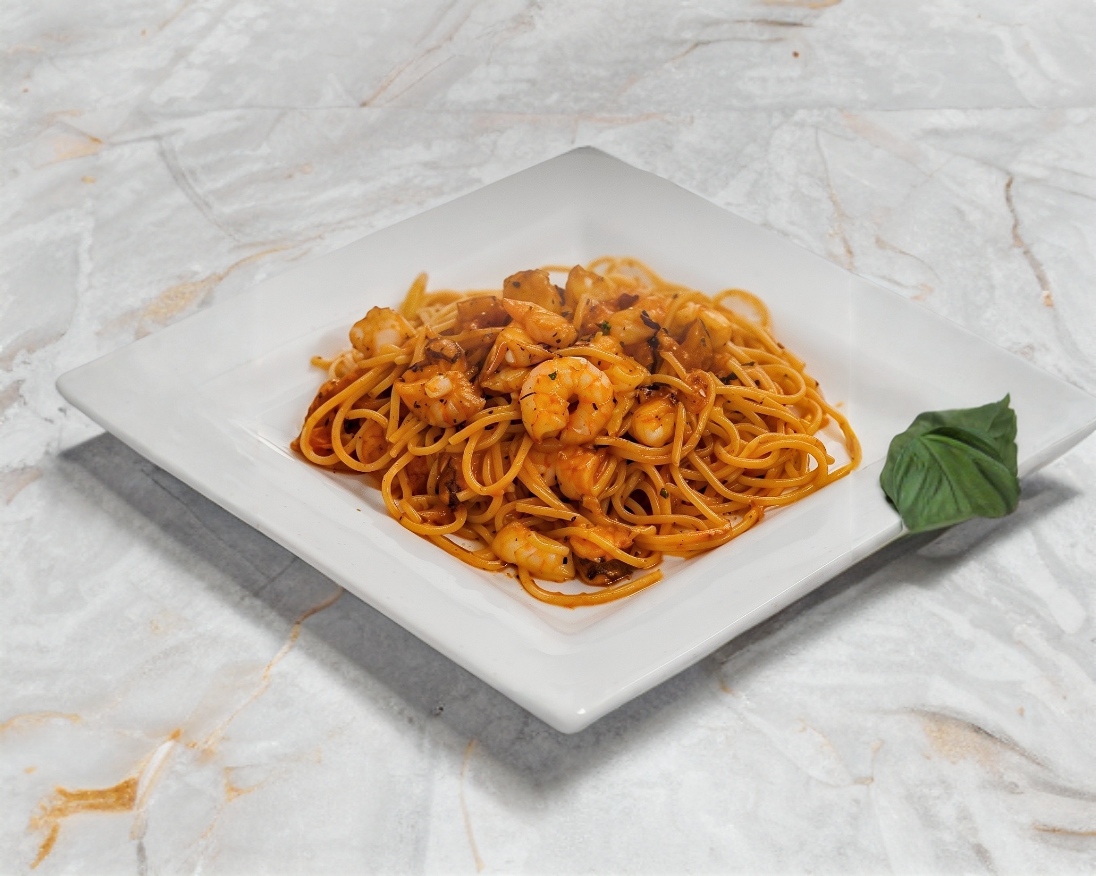 Camarón, pulpo, pescado, ajo y albahaca fresca.