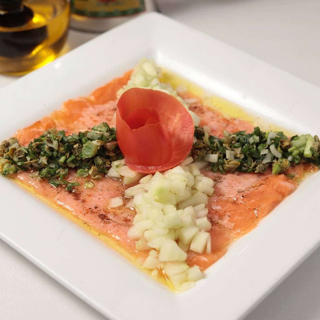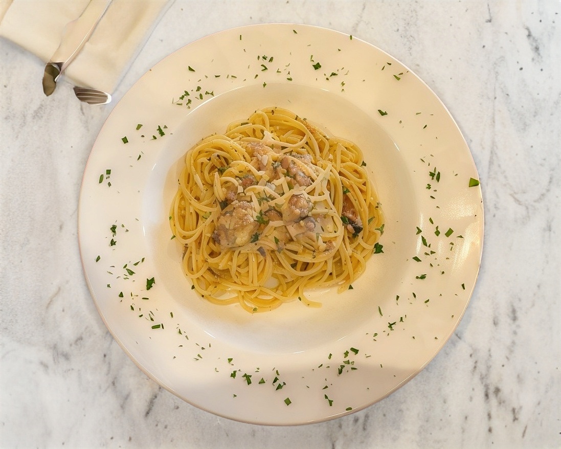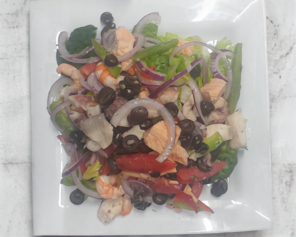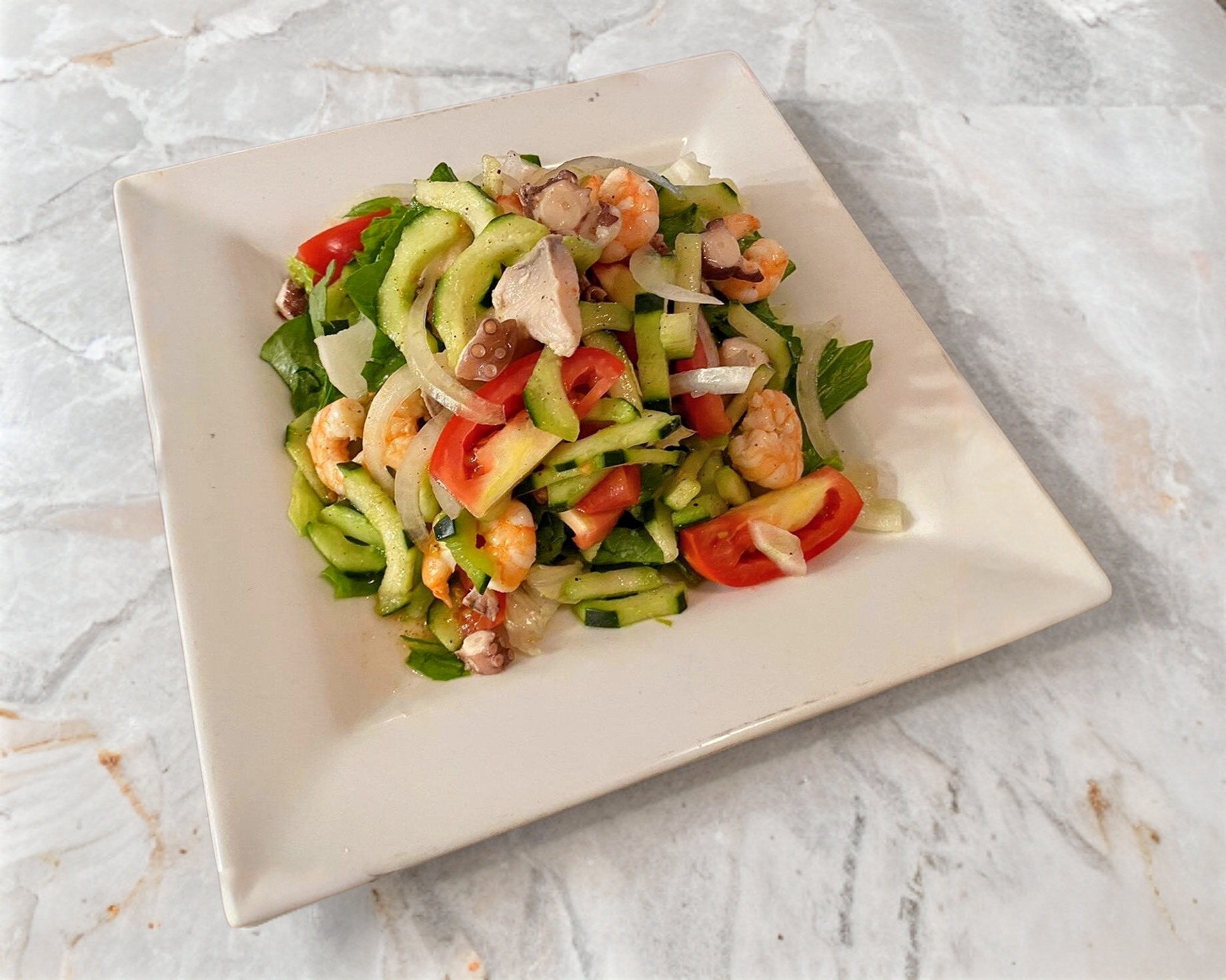 Camarón, pulpo, pescado, ajo y albahaca fresca.