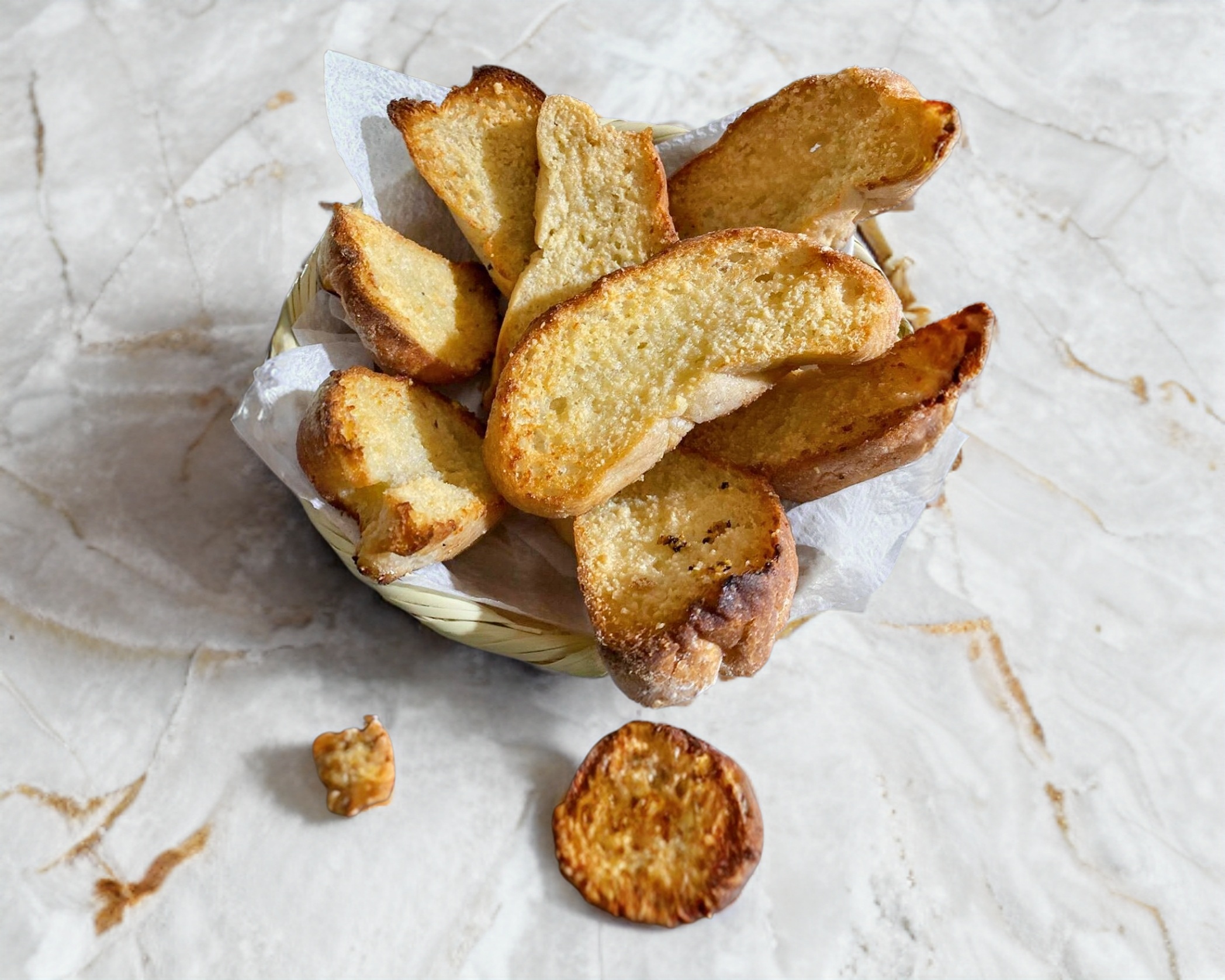(8pzs) Rebanadas de pan con ajo y queso parmesano.