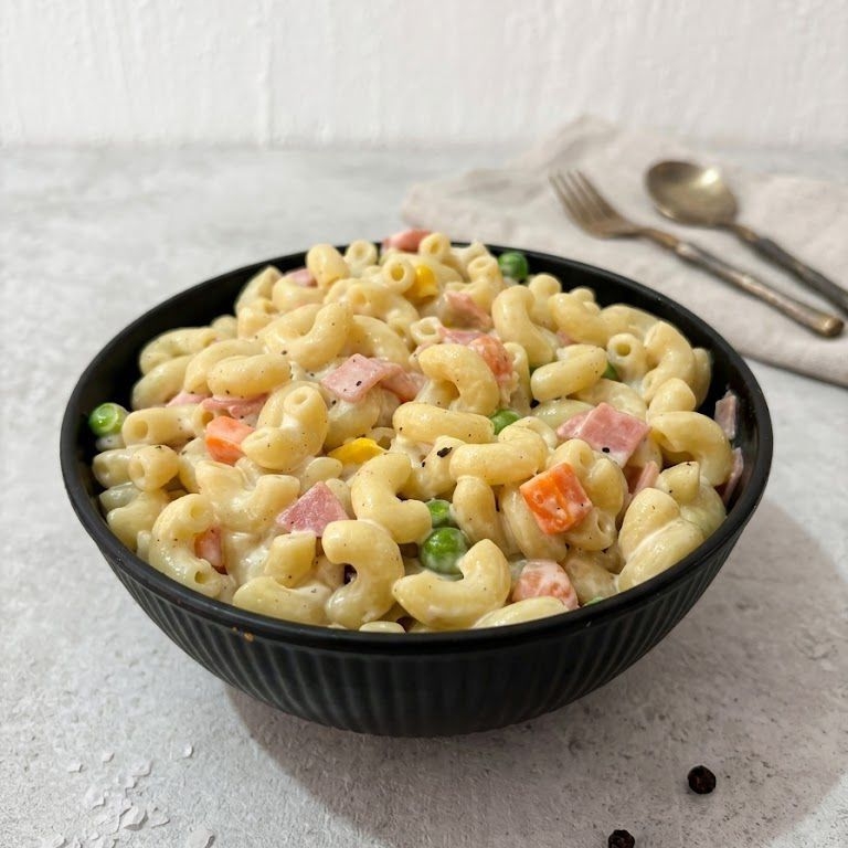 Sopa de coditos con jamon, salchicha, crema, mayonesa y elote amarillo.