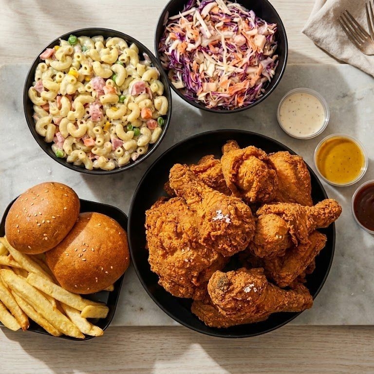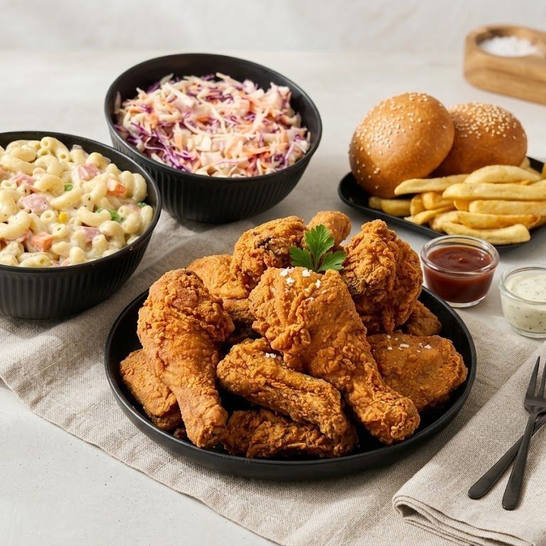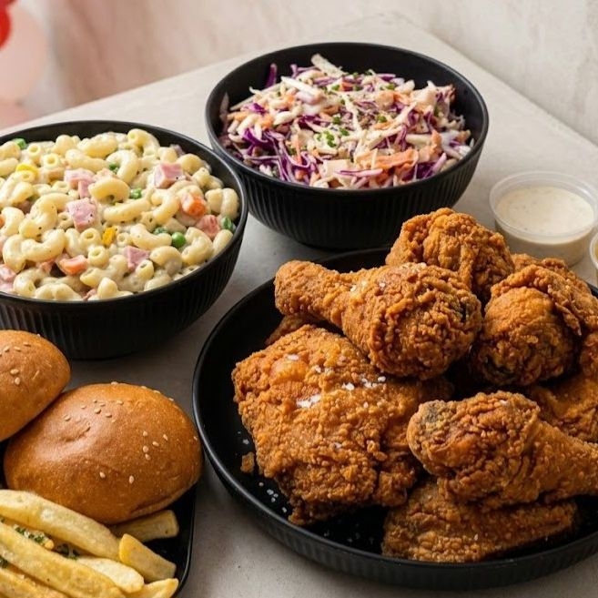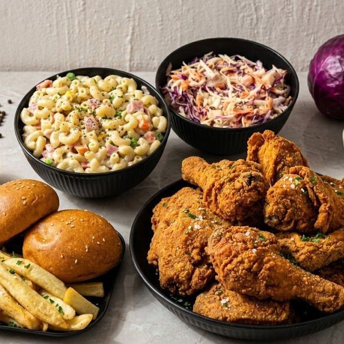 1/2 kilo de pollo, 1/2 lt de sopa fria o una orden de papas, 1 refresco sabor de 1.5 lt y 3 panecillos.
