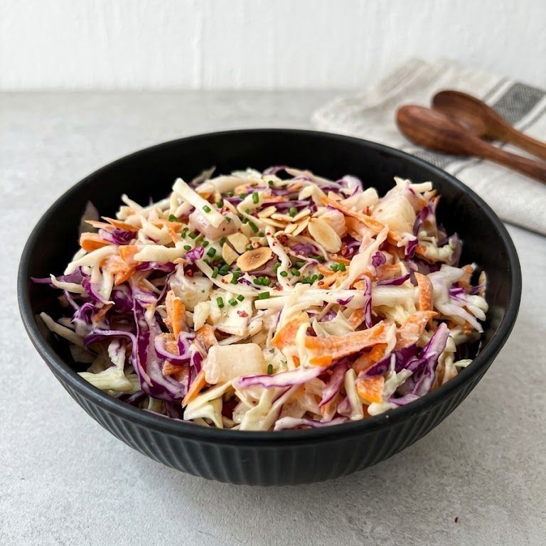 Ensalada de repollo y col morada con aderezo dulce, zanahoria y piña.
