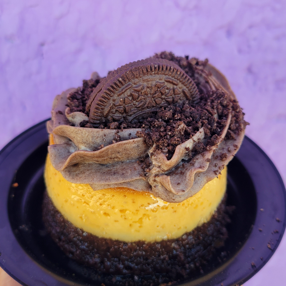 Deliciosa costra de galleta, con relleno cremoso de queso y crema de OREO encima