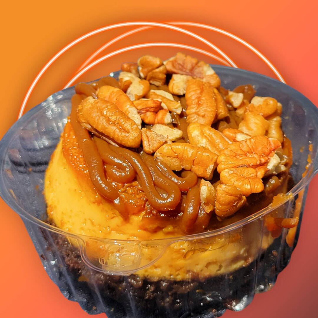 Rico flan napolitano con base de pastel de chocolate y una capa de azúcar caramelizada, con topping de cajeta y nuez