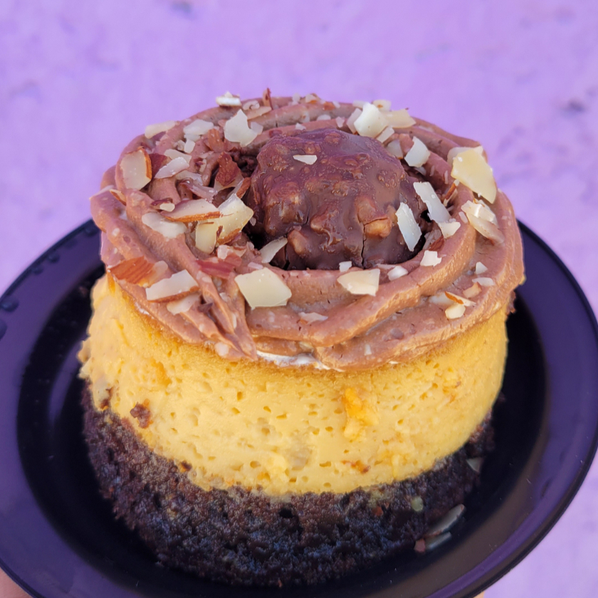 Base de galleta, relleno de una mezcla de queso, con topping de Nutella, Almendras y Ferrero