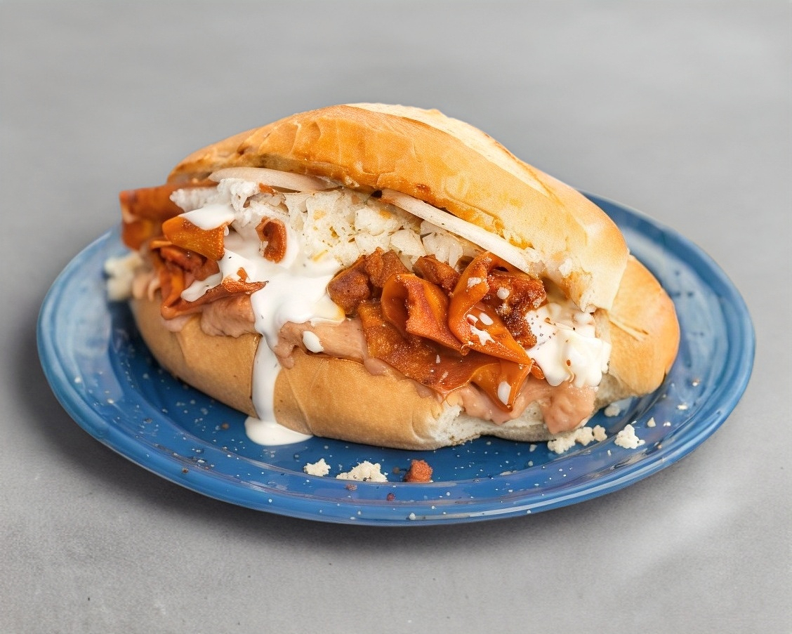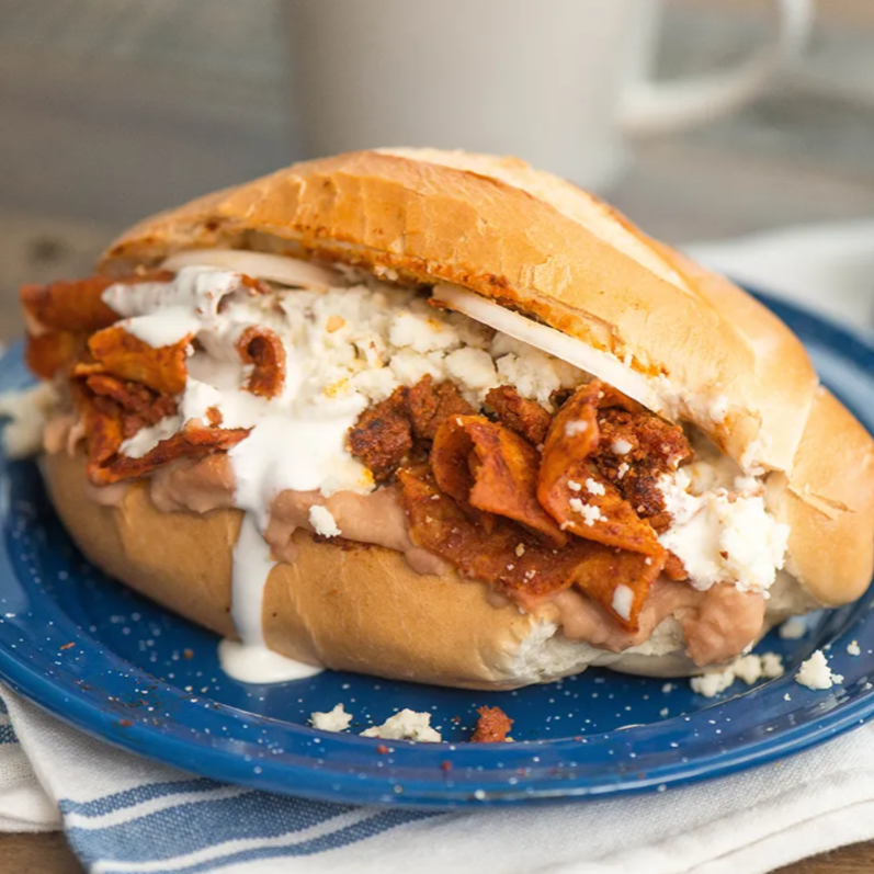 Deliciosa torta de pastor rellena de crujientes chilaquiles bañados en tu salsa favorita