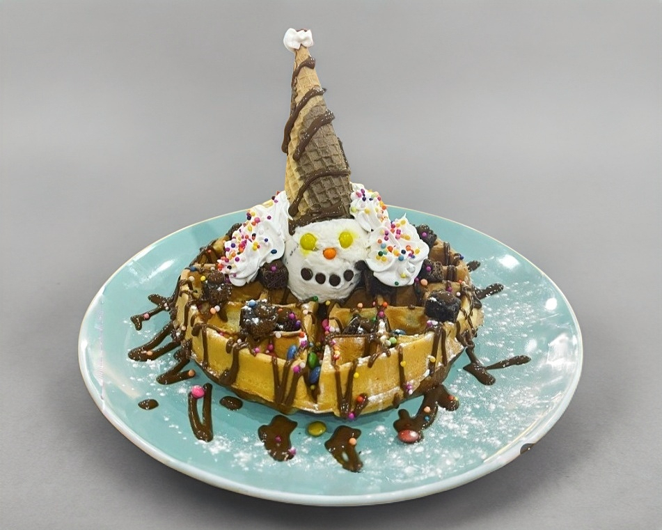 Increible waffle con rico helado de vainilla, crema batida y adornado con lunetas, chocolate hersheys