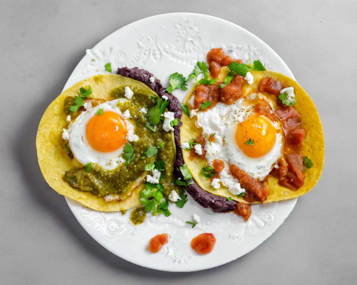Delicios huevos divorciados estrellados bañados en salsa Poblana y Chipotle