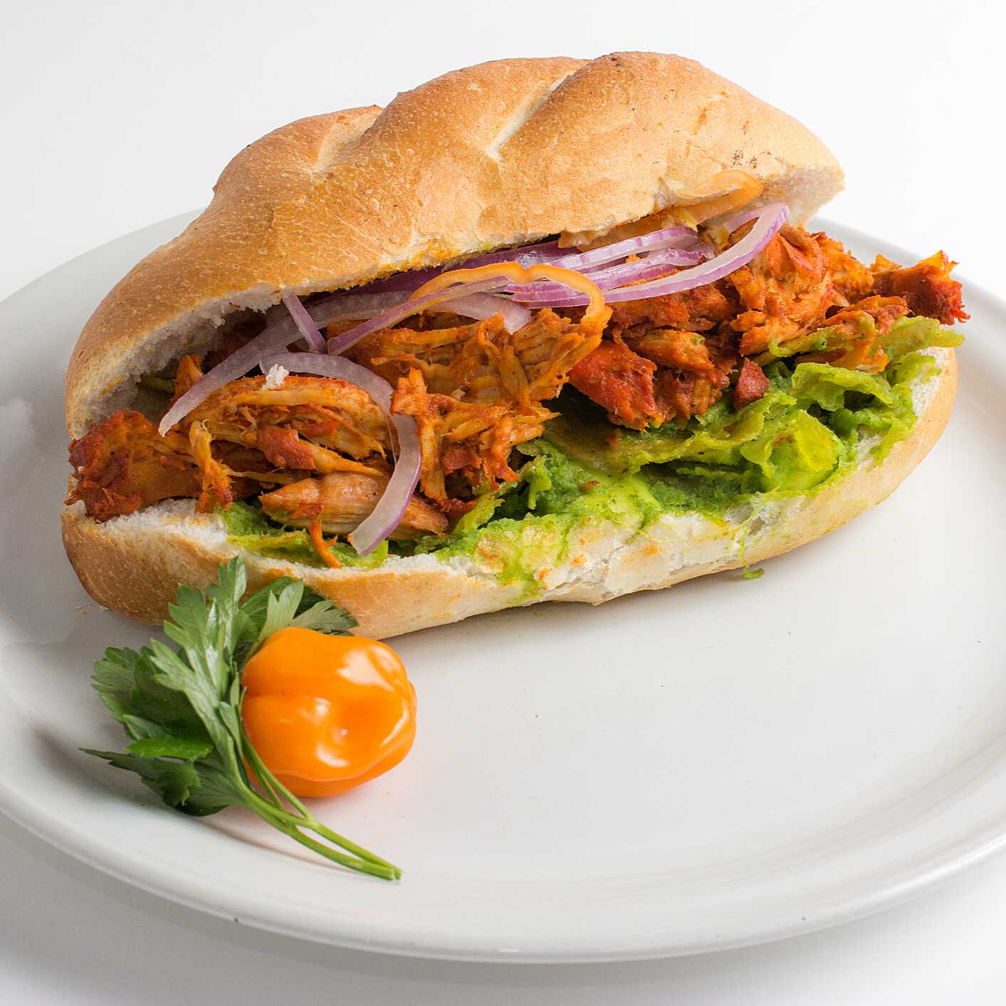 Baguette relleno de chilaquiles verdes y cochinita pibil. Decorado con cebolla morada, aguacate y habanero.