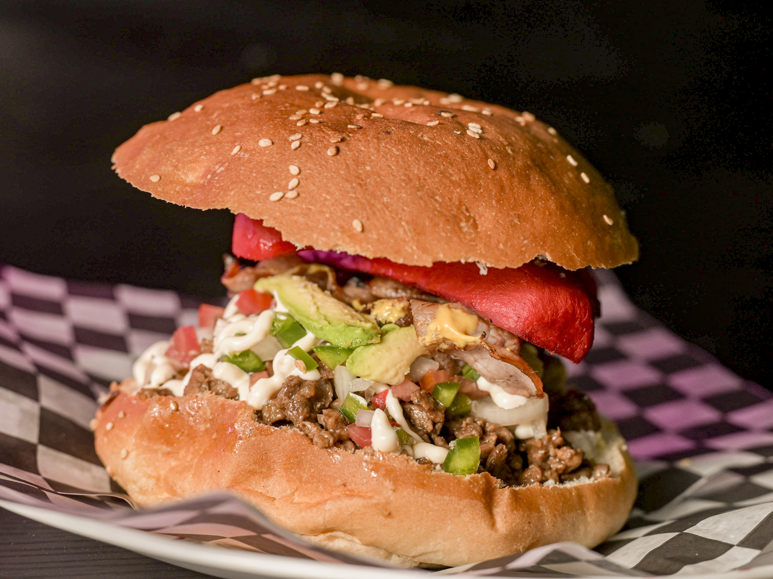 Carne, queso amarillo y blanco, jamón, tocino, aderezo BBQ, lechuga, cebolla, tomate, chile y aderezo.