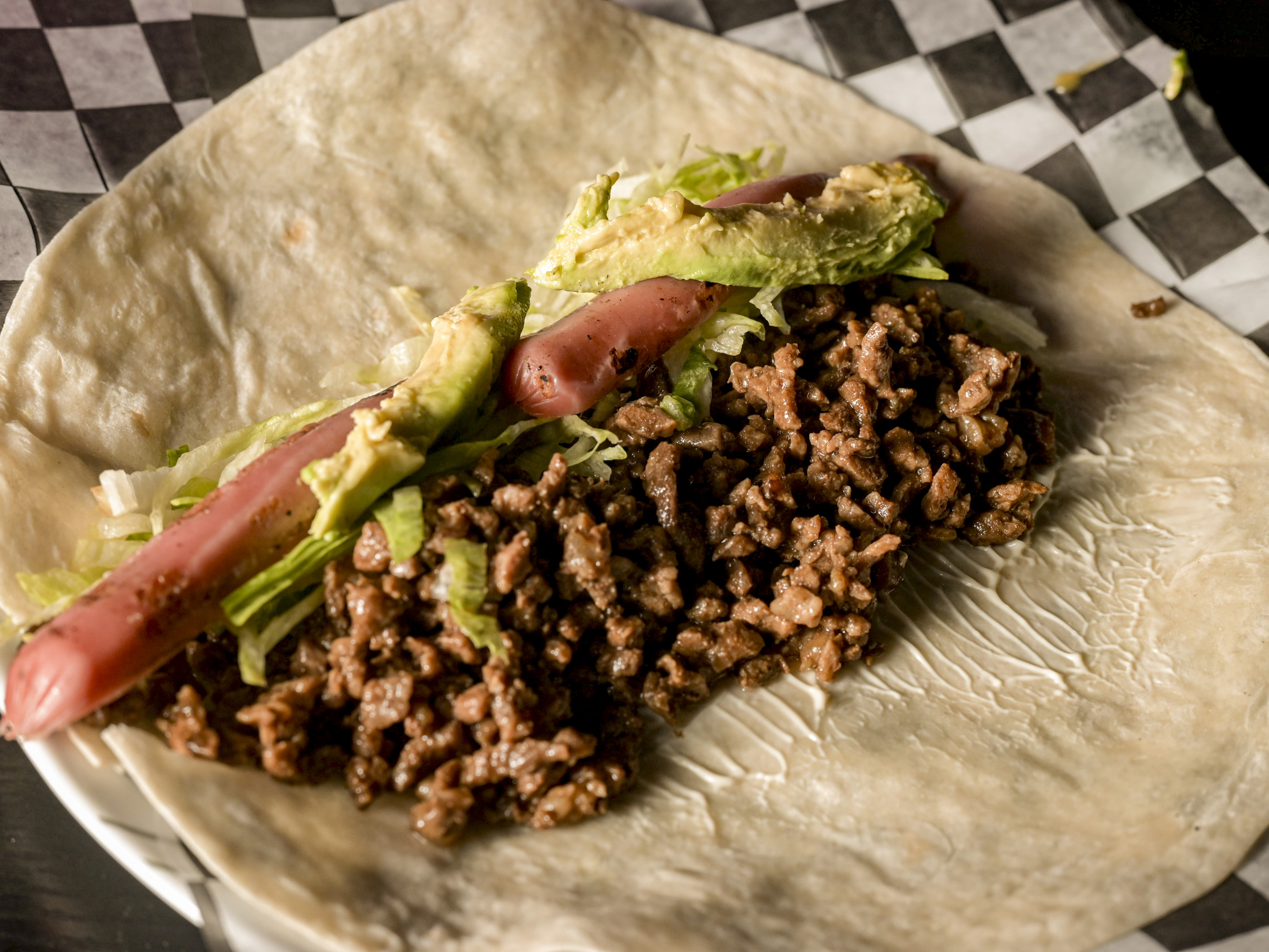 Carne asada, queso blanco, cebolla asada, salchicha para asar y aguacate.