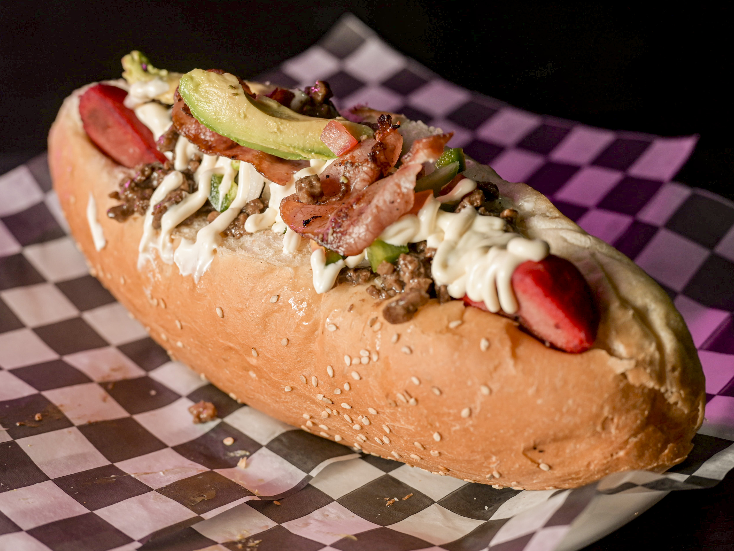 Doble carne, queso amarillo y blanco, jamón, tocino, salchicha, lechuga, cebolla, tomate, chile y aderezo.