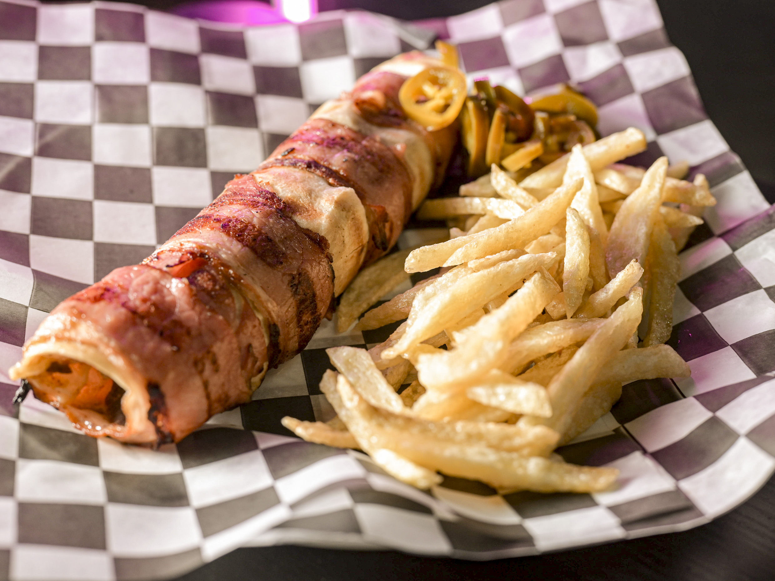 Salchicha, tocino, carne de hamburguesa, deshebrada, queso amarillo, jamón y chile.