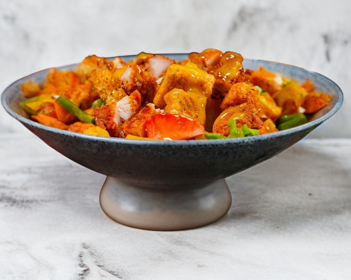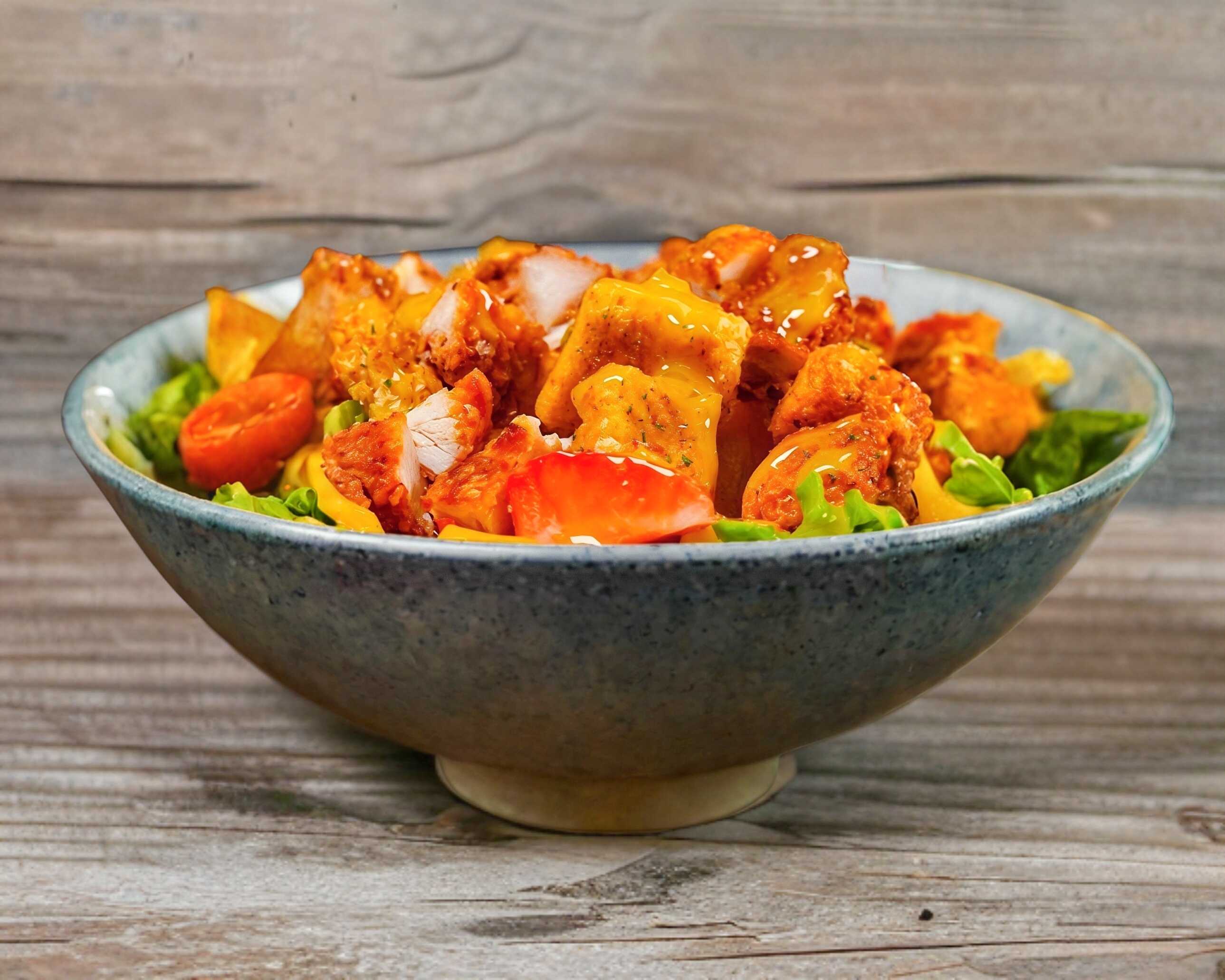 Mix de lechugas, Pollo Crispy, zanahoria, col morada, tomate cherry, fresa, duraznos, piña, queso parmesano, crutones, y un rico aderezo miel mostaza.