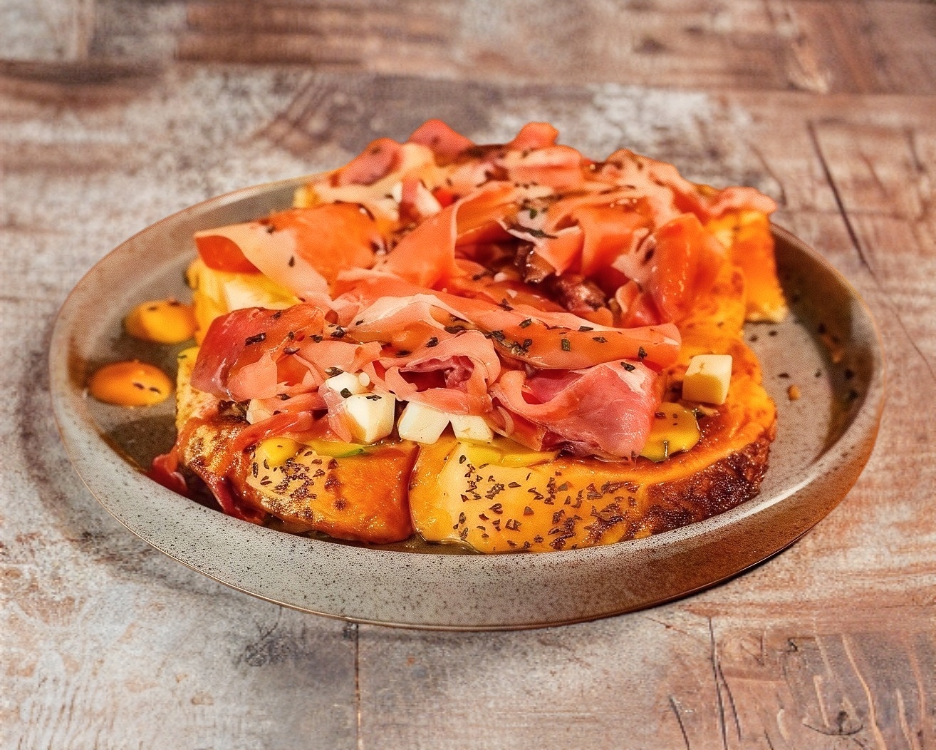 Pan blanco con salsa de tomate de la casa, mezcla de carnes frias (jamon, salami, pepperoni y salchicha) y queso gratinado acompañado de papas fritas o porción de chilaquiles.