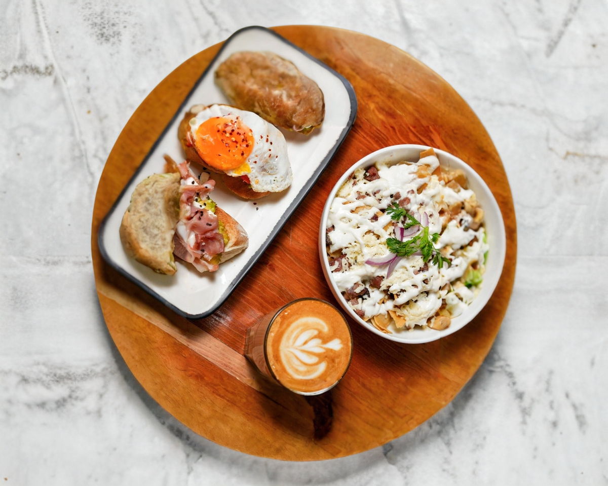 Tres piezas de pan tostado, con aguacate, queso panela en trozos, tomate cherry, ajonjoli, y vinagreta, con jamon serrano o huevo estrellado.
