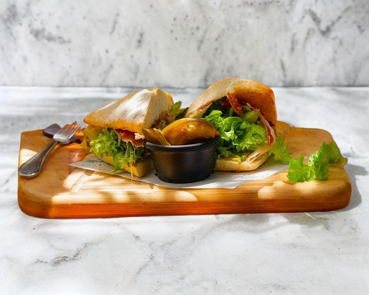 Chapata con jamón de pavo, queso manchego, lechuga,tomate, pepino, pepinillos, cebolla morada, aderezo de chipotle, mayonesa y mostaza.