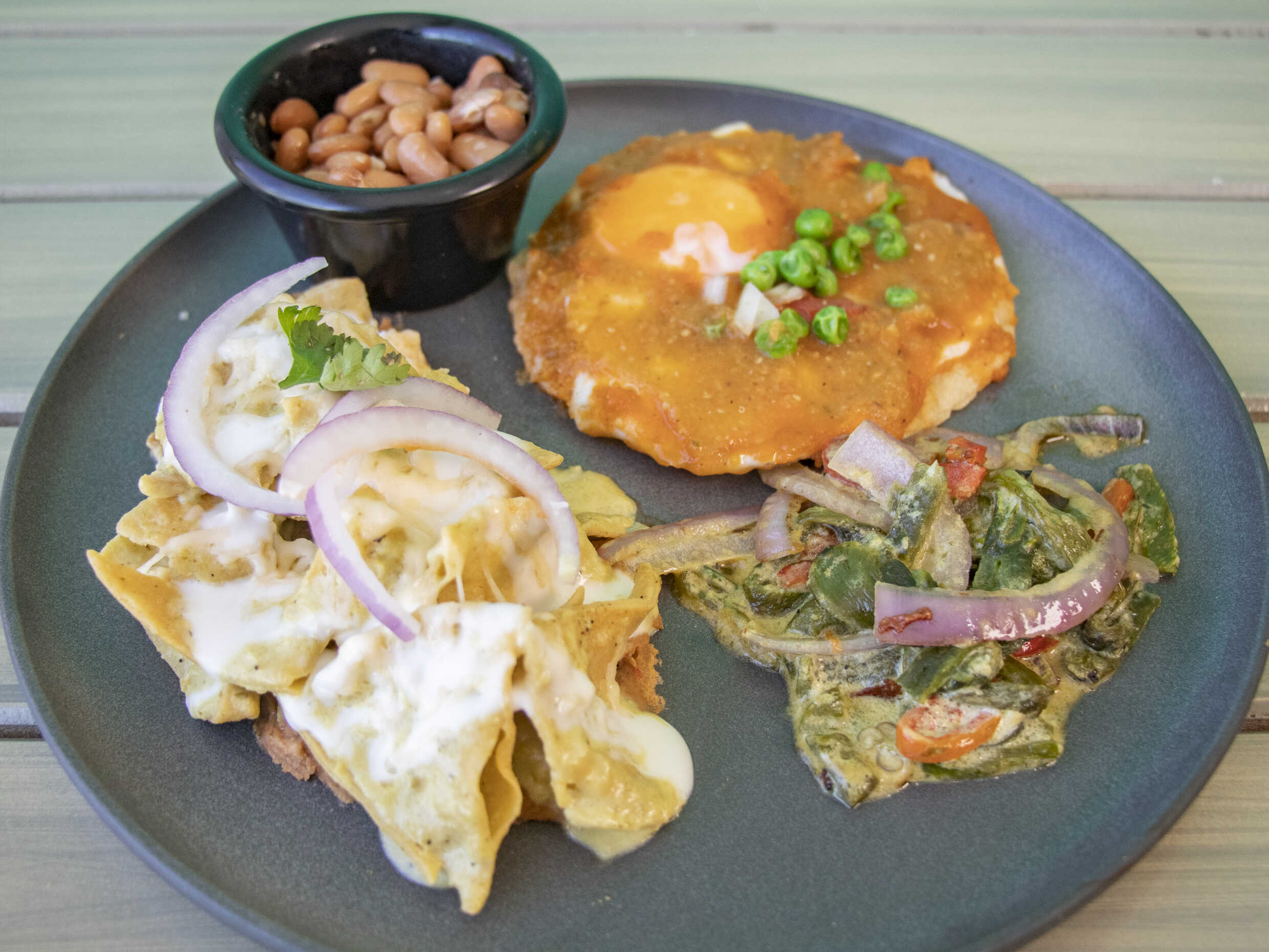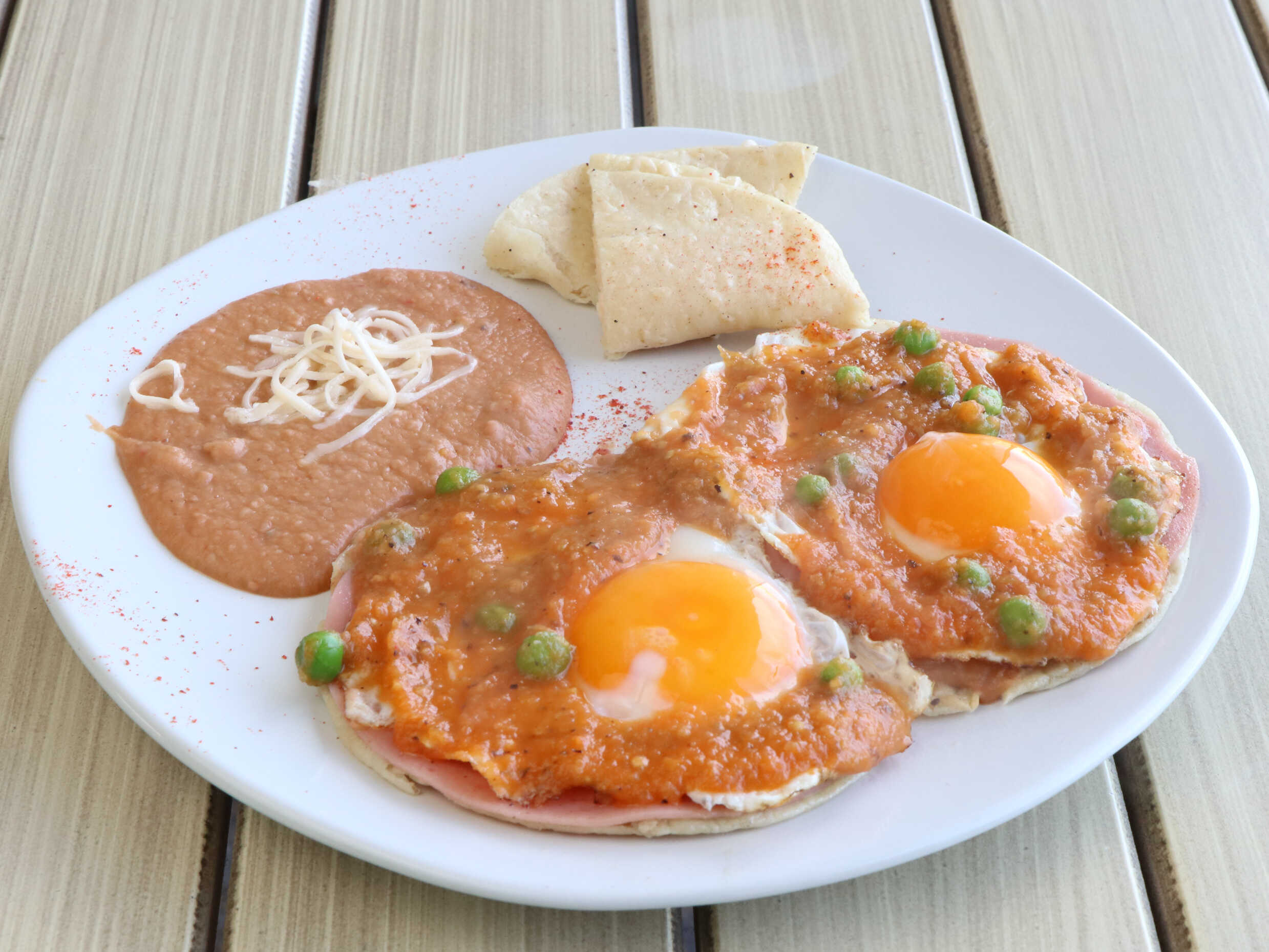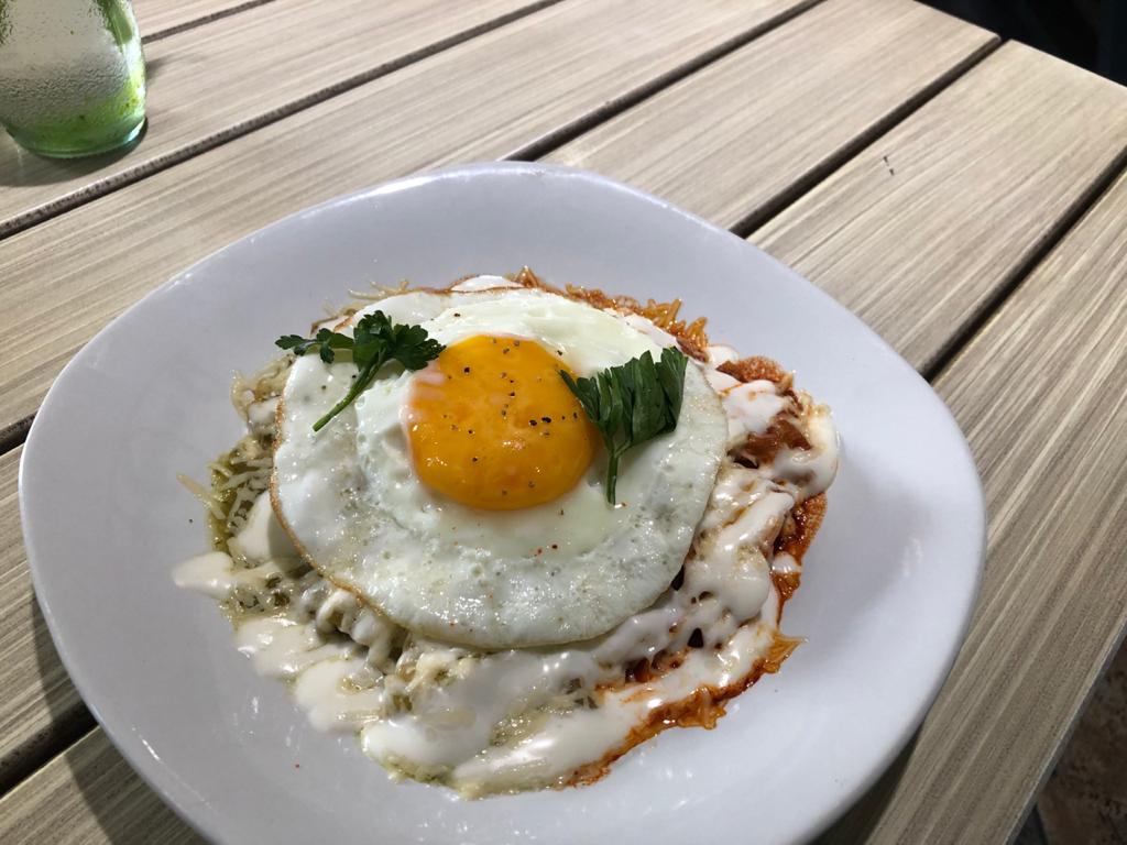 Motuleño con chilaquiles poblanos con guarnición de rajas con queso y frijolitos.