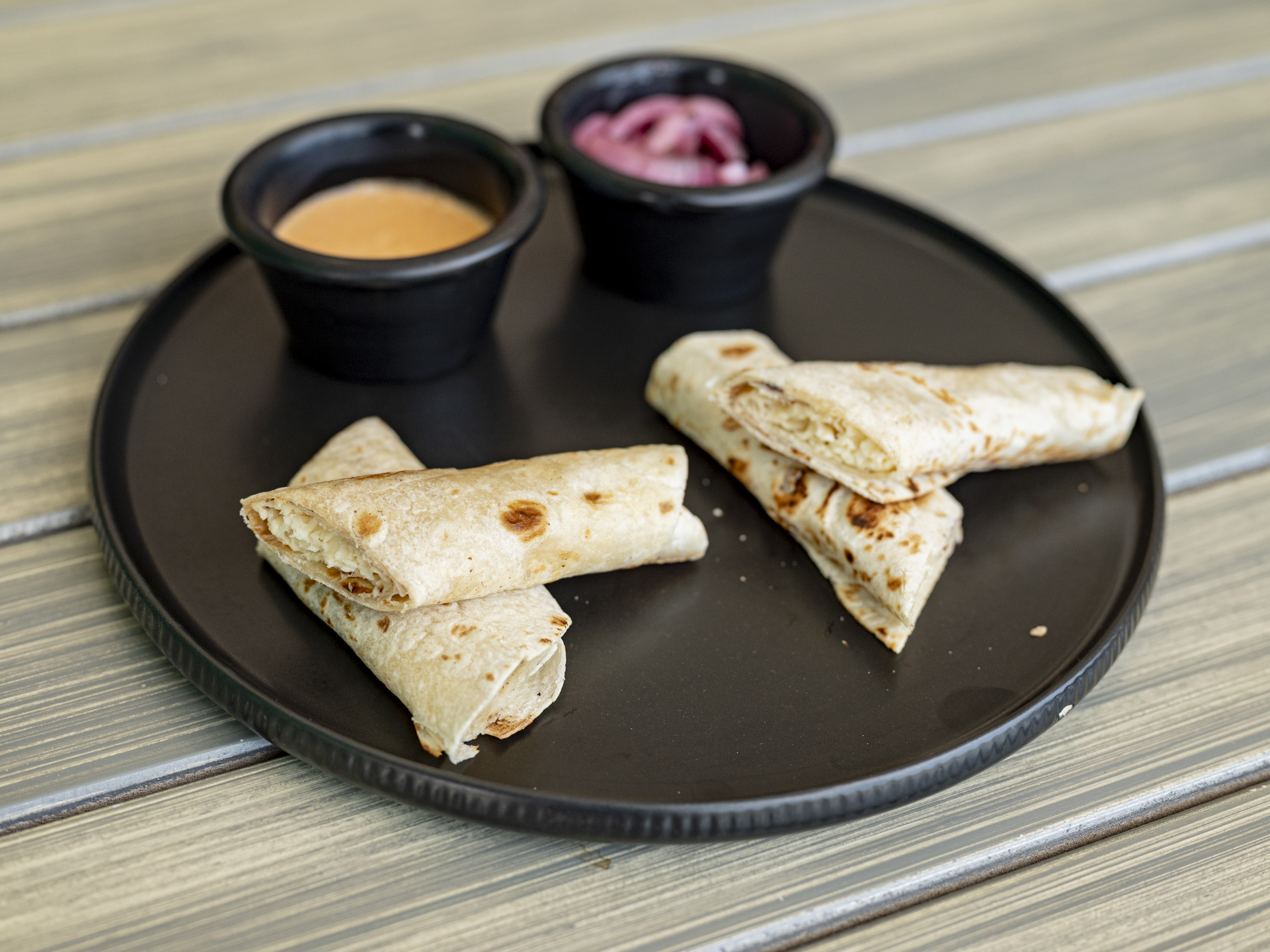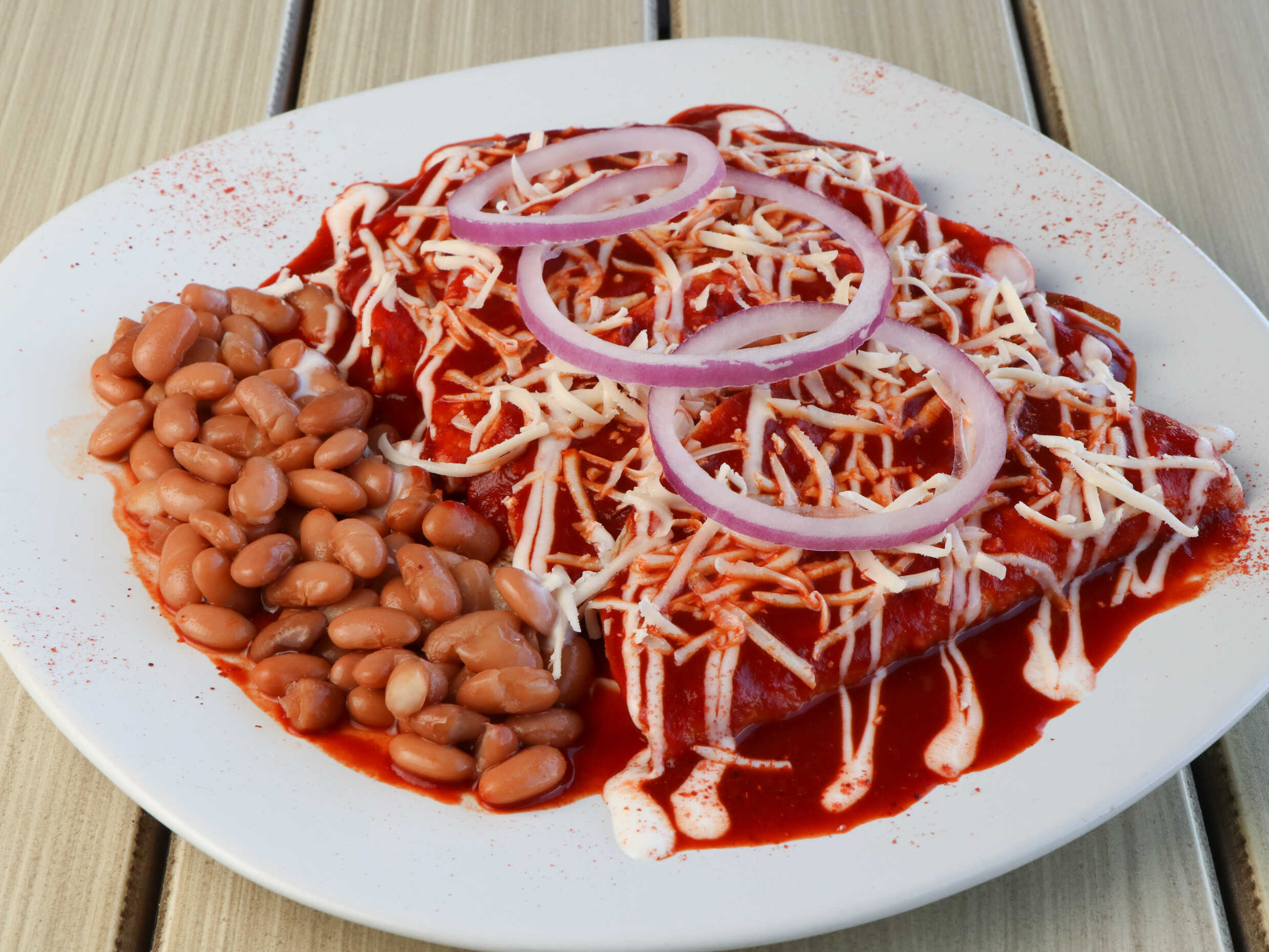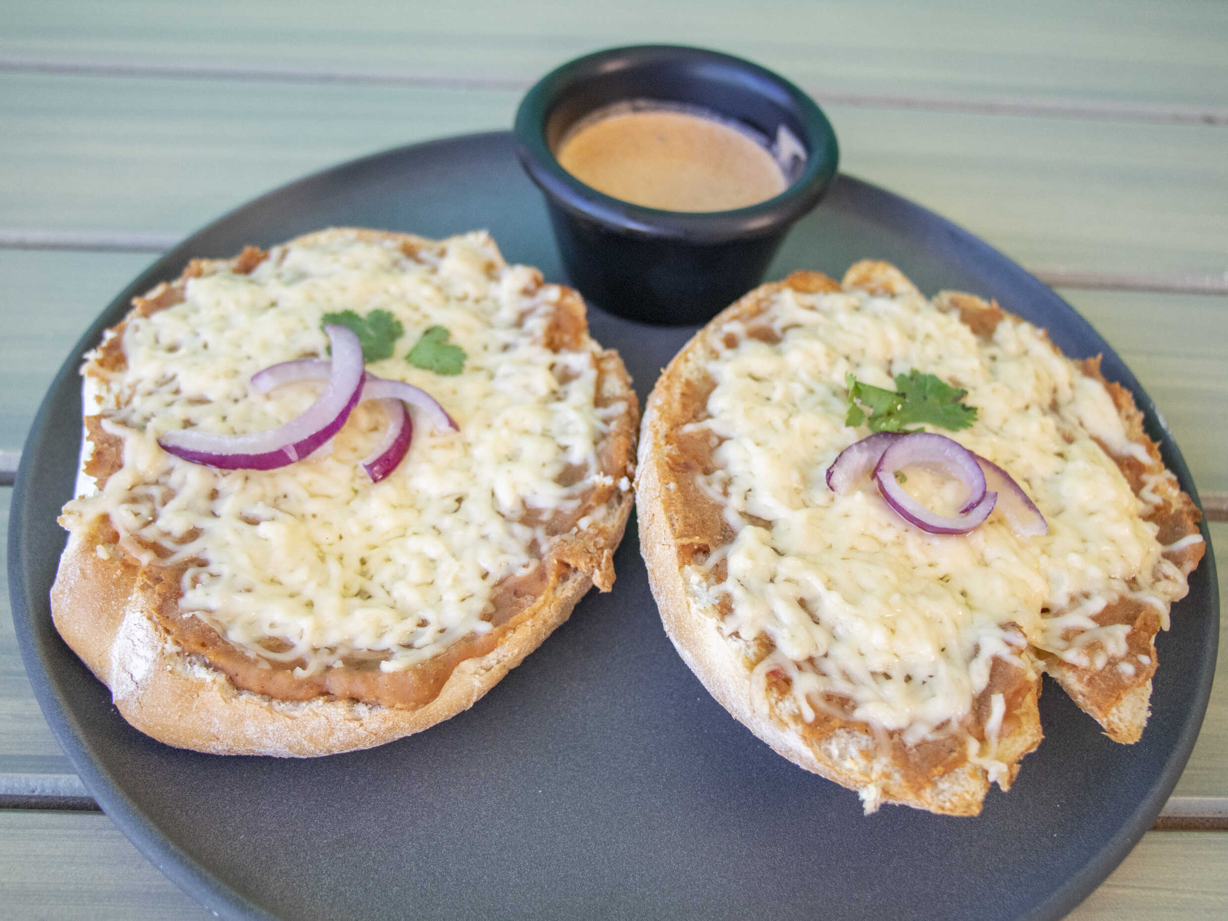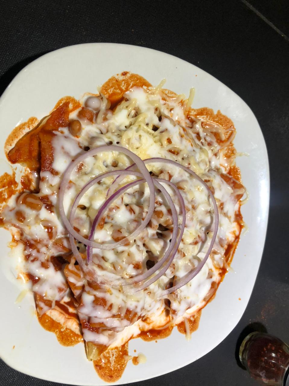 Lleva salsa, frijoles, queso, crema y cebolla.