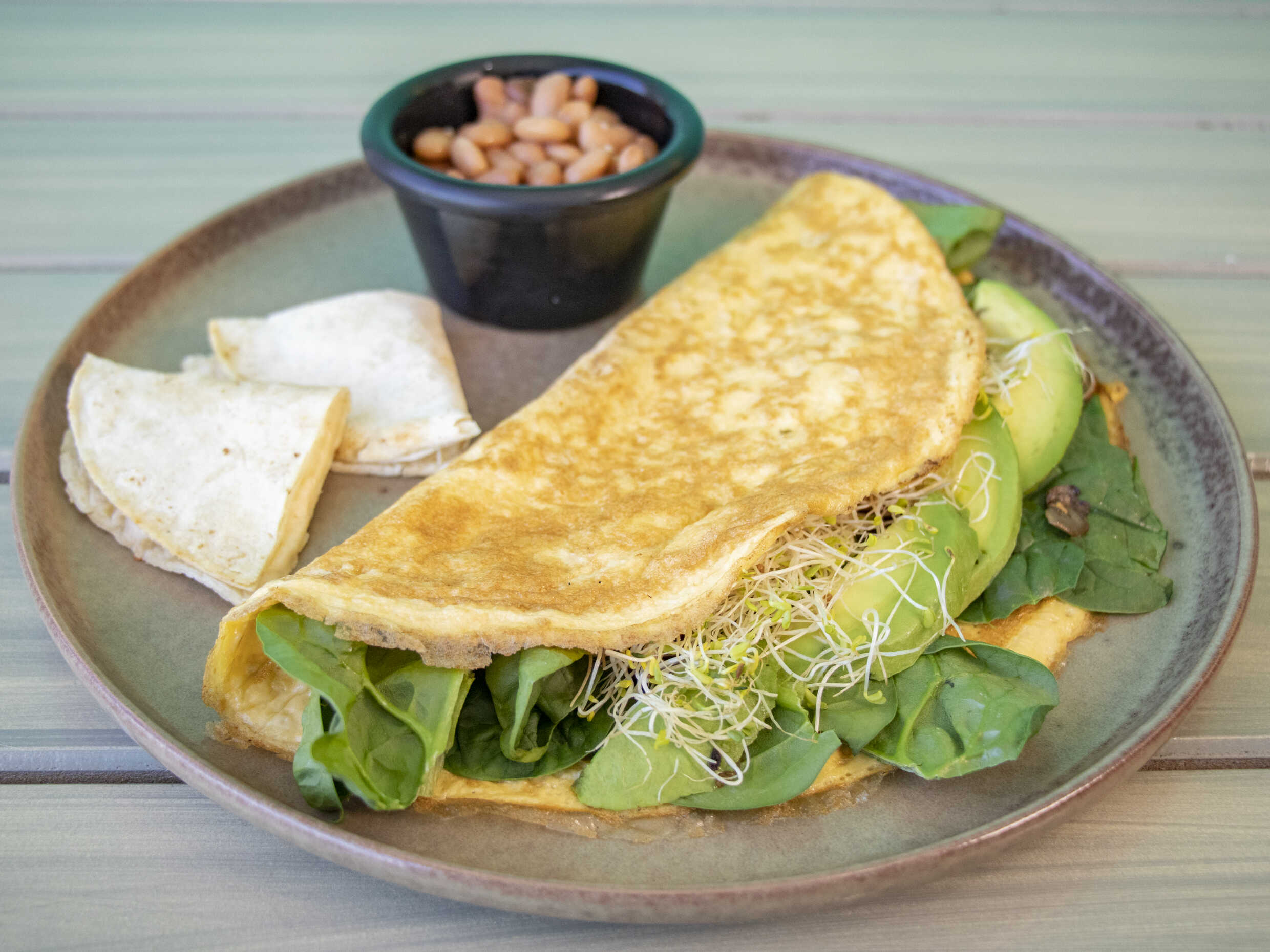De claras, relleno con pimiento, espinacas y acompañado de ensalada