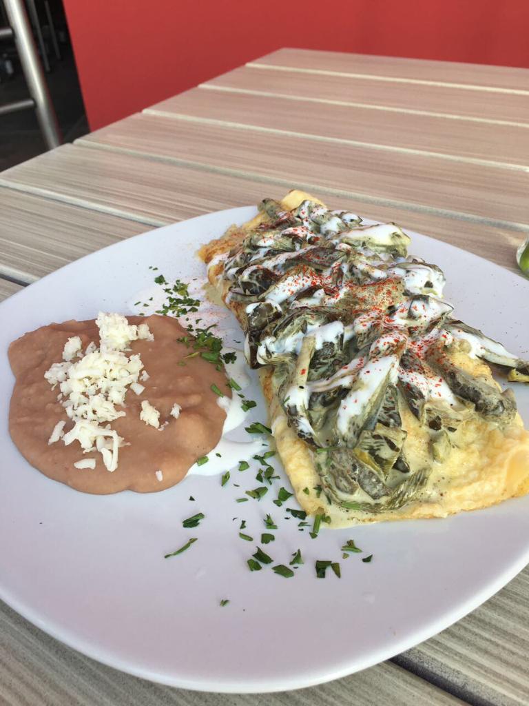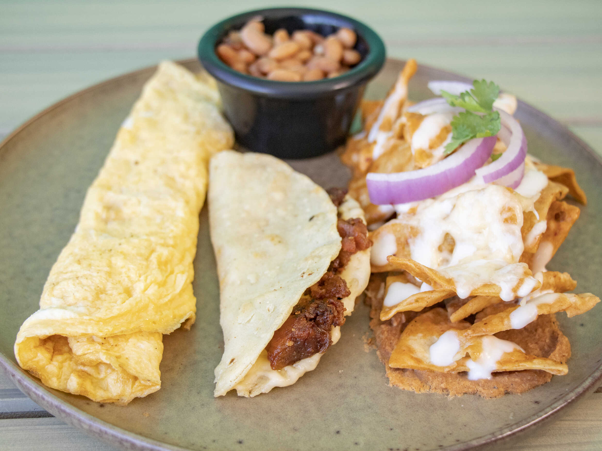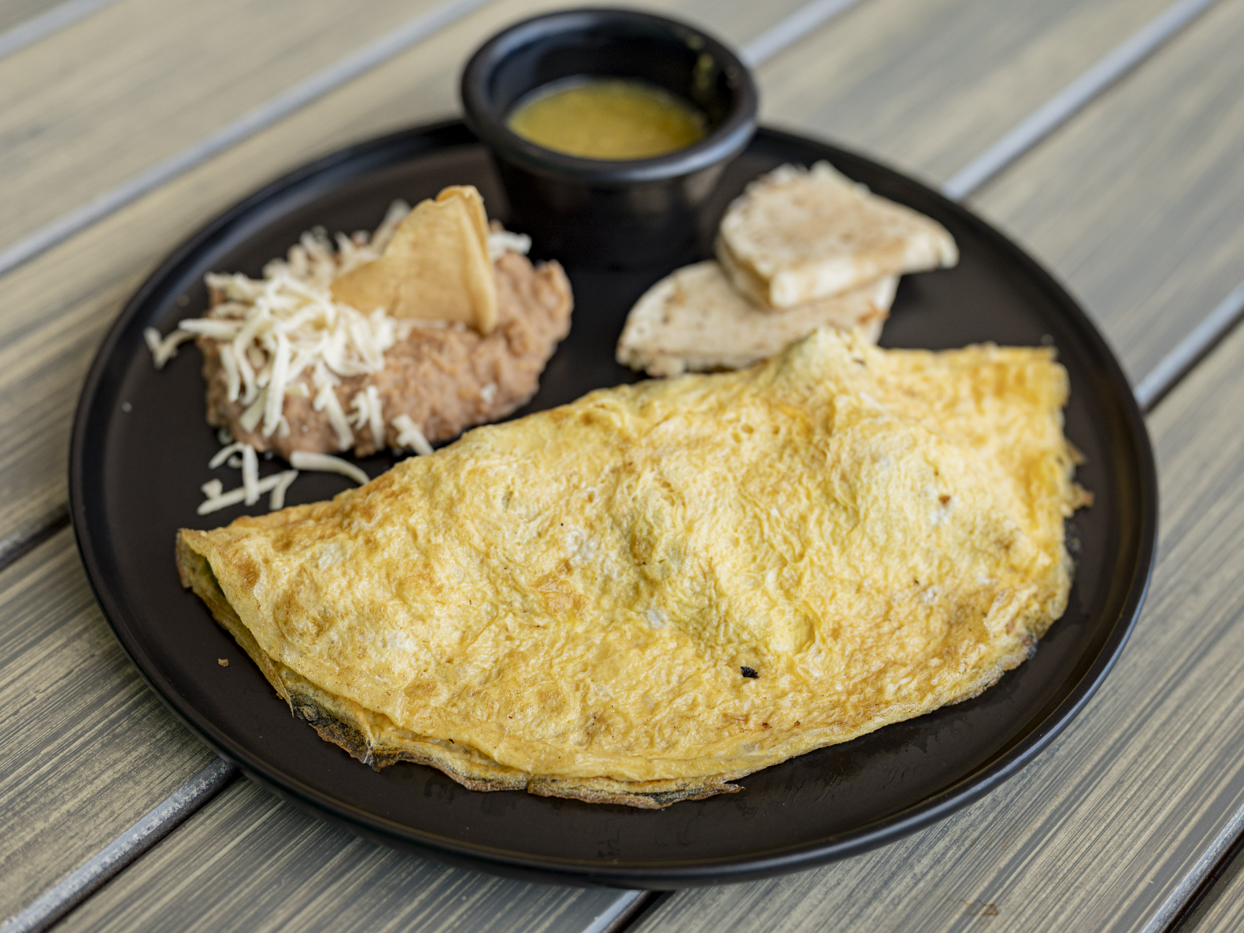 Omelette acompañado de chilaquiles chipotle con quesadilla de chicharrón.