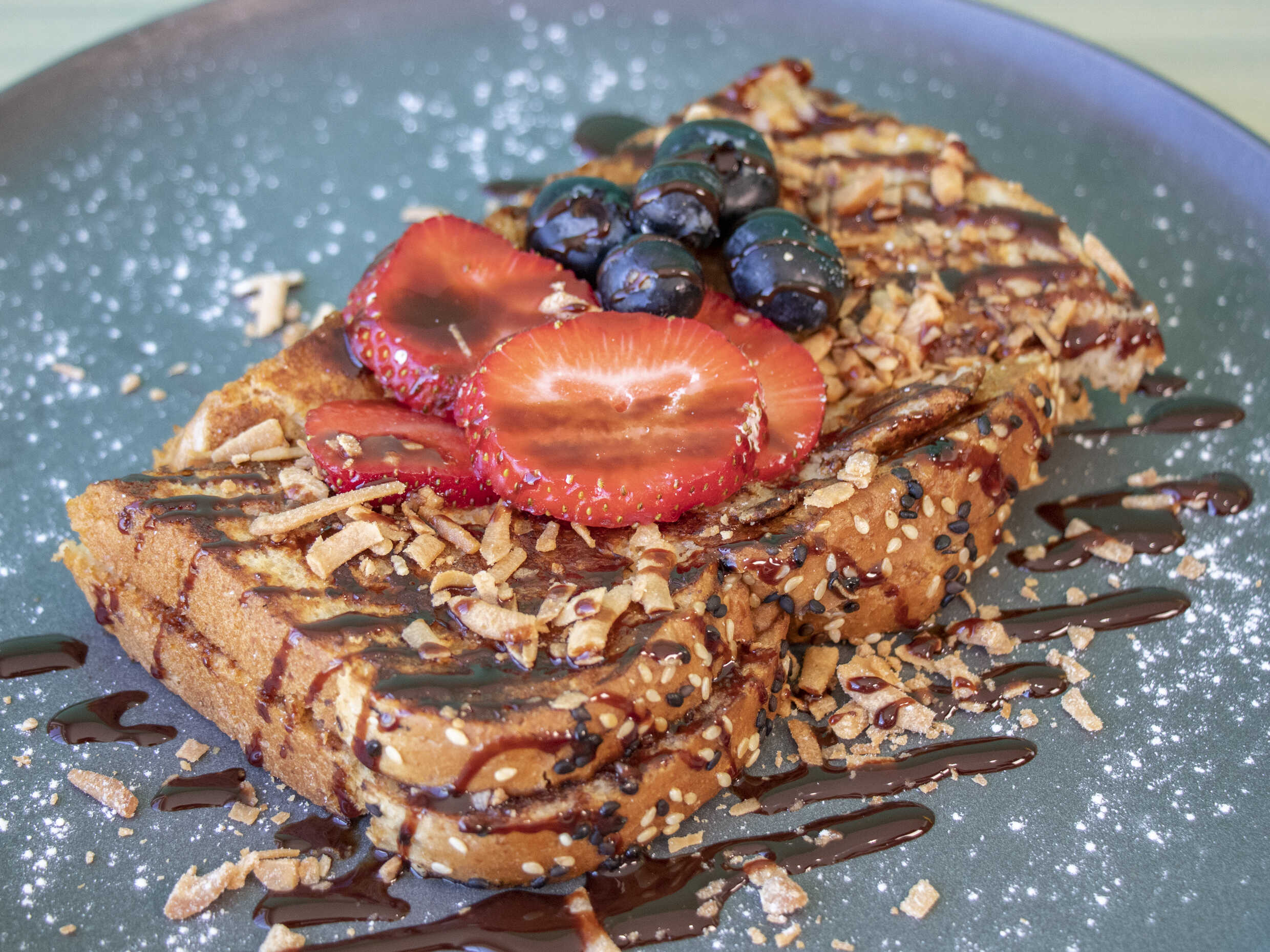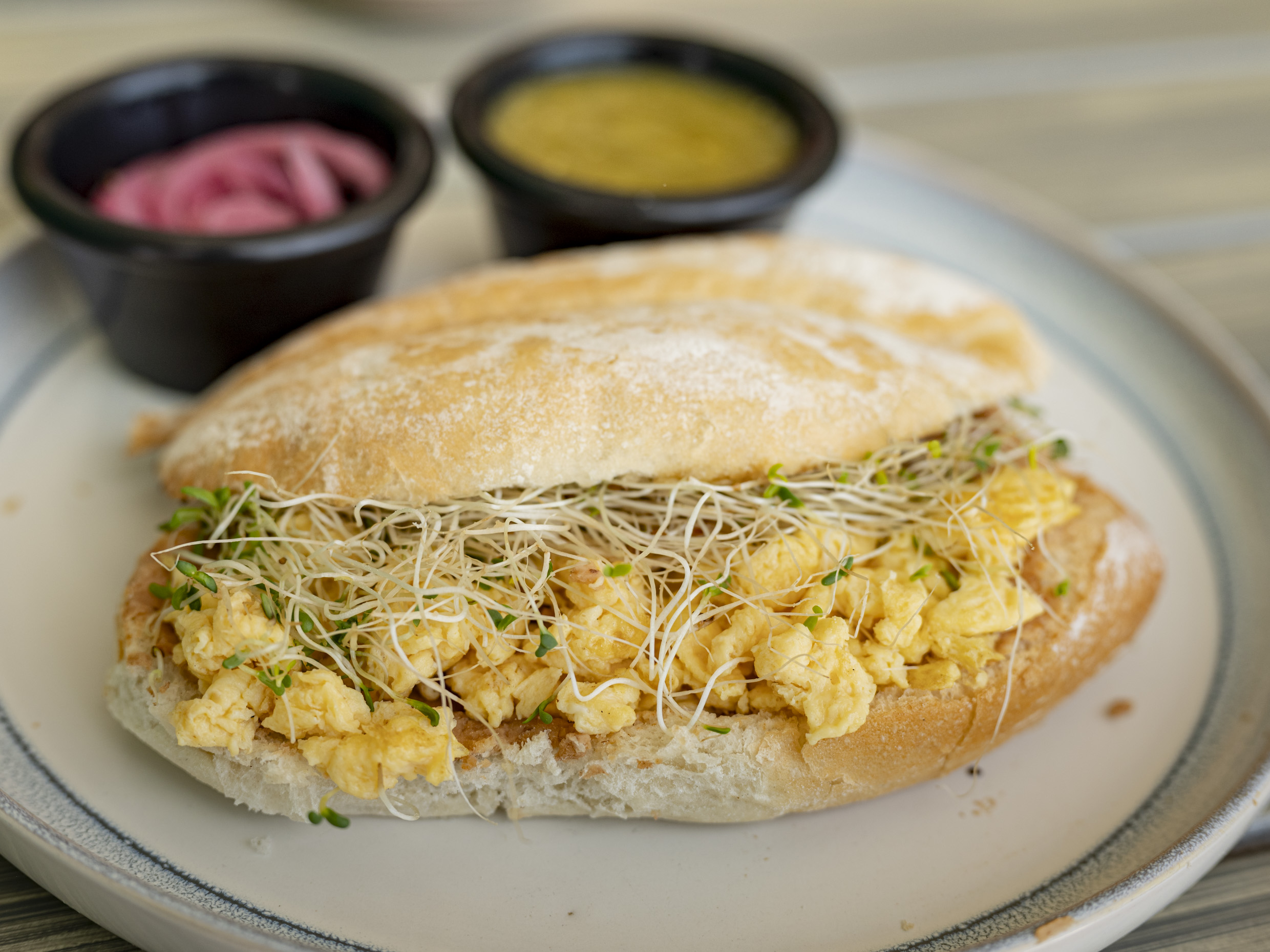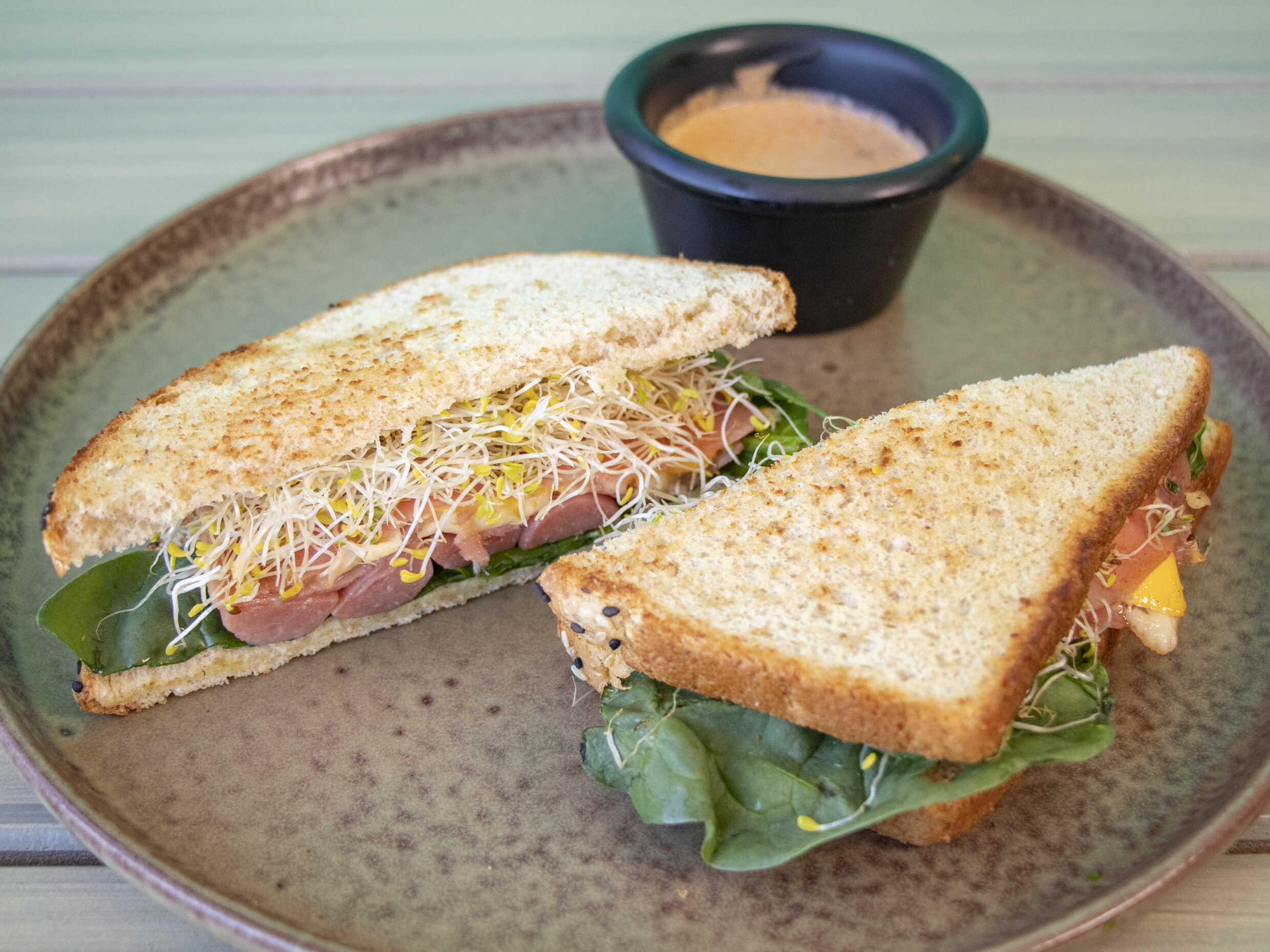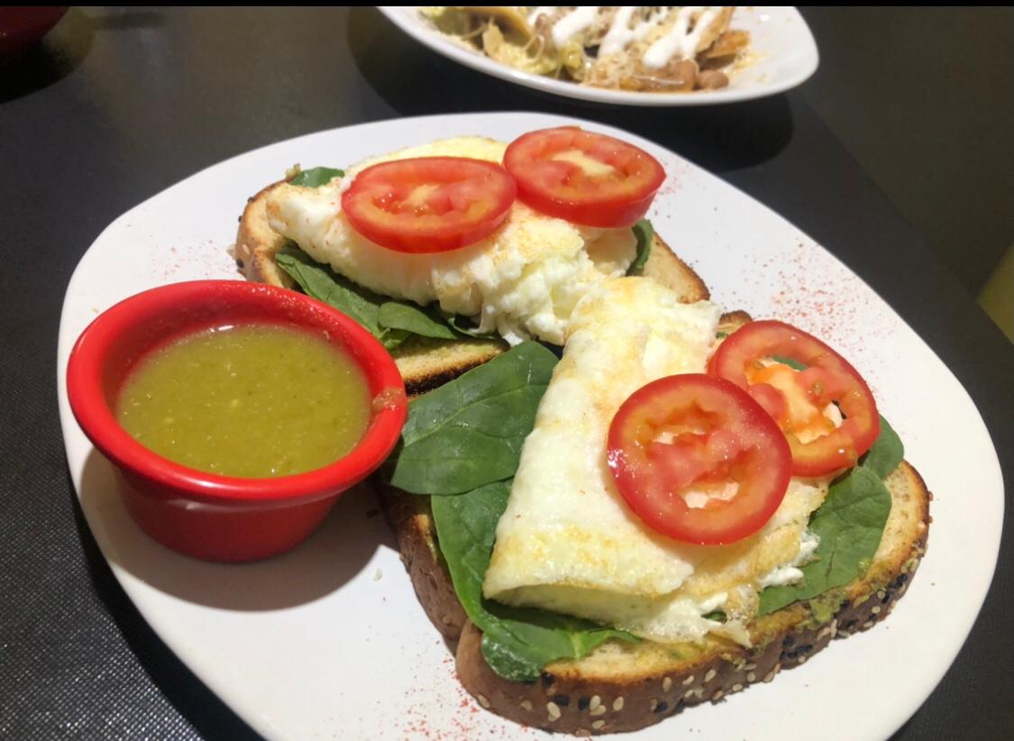Dos piezas de pan tostado unA con aguacate y champiñones y la otra con huevo revuelto o claras con germinado y tomate