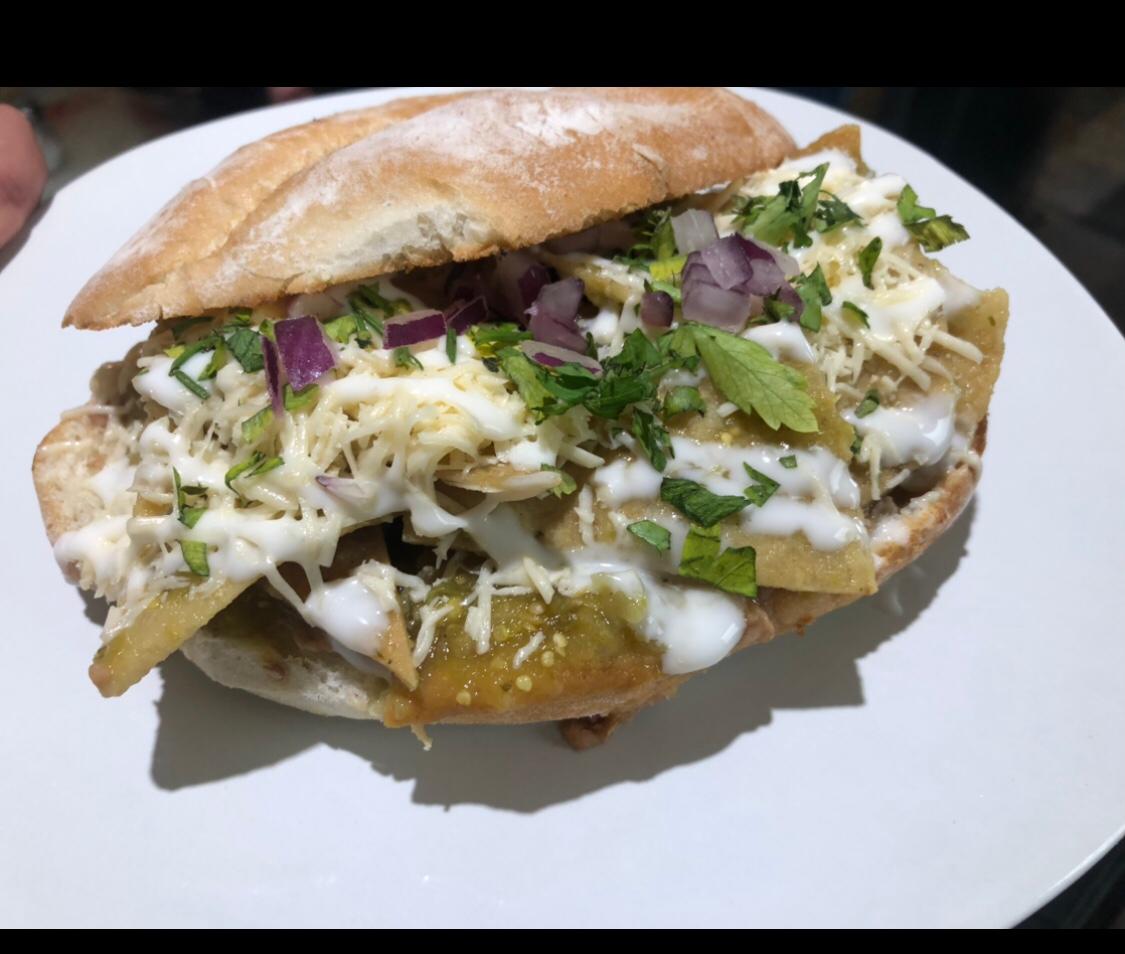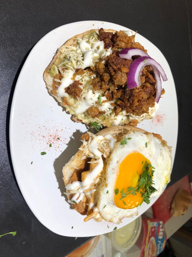 2 Piezas de pan con mantequilla y frijoles, cubiertos con chilaquiles con un huevo estrellado y la otra con chicharrón.
