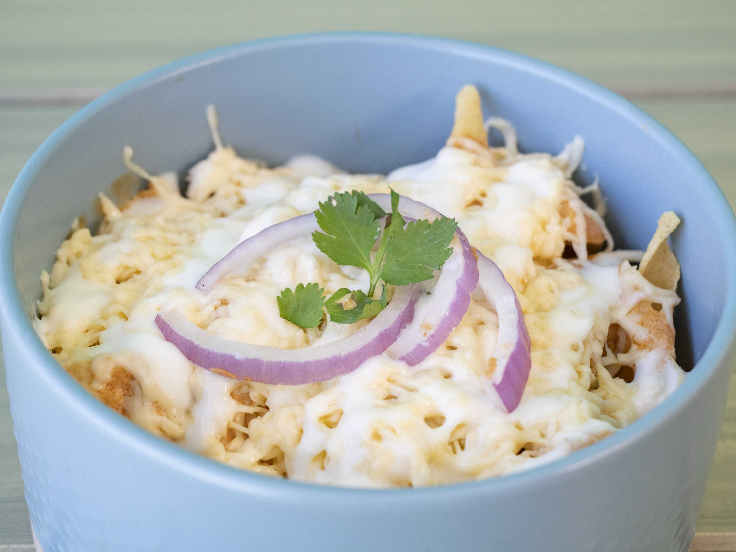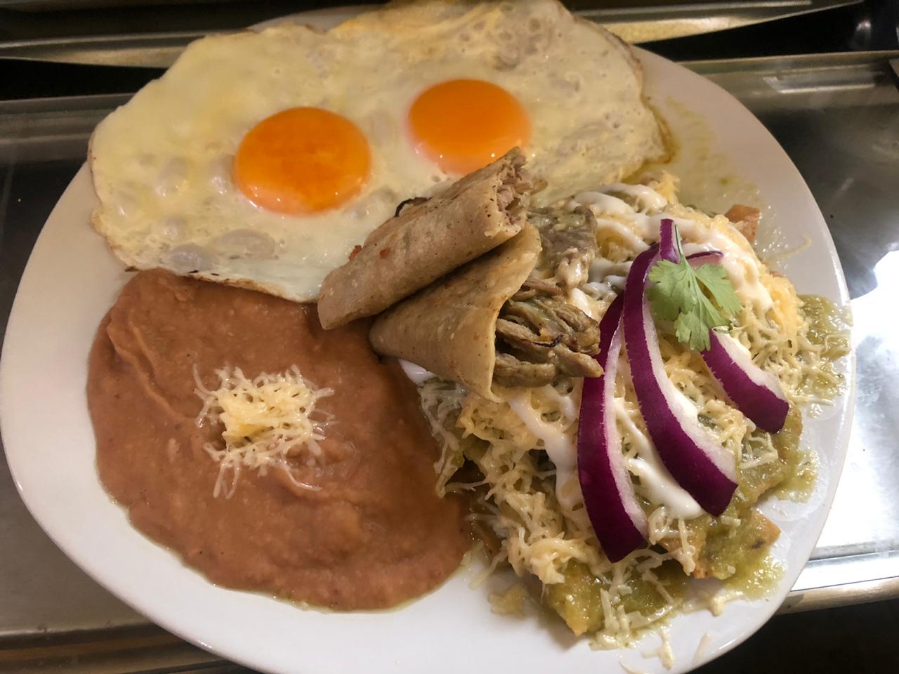De chilaquiles poblanos con una pasadita de habanero, pollo, chilorio y tocino.